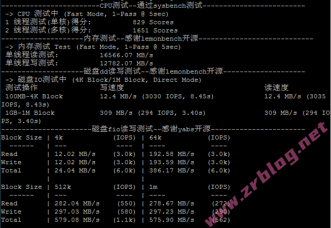 CPU跑分、内存和磁盘dd/fio读写测试结果:
