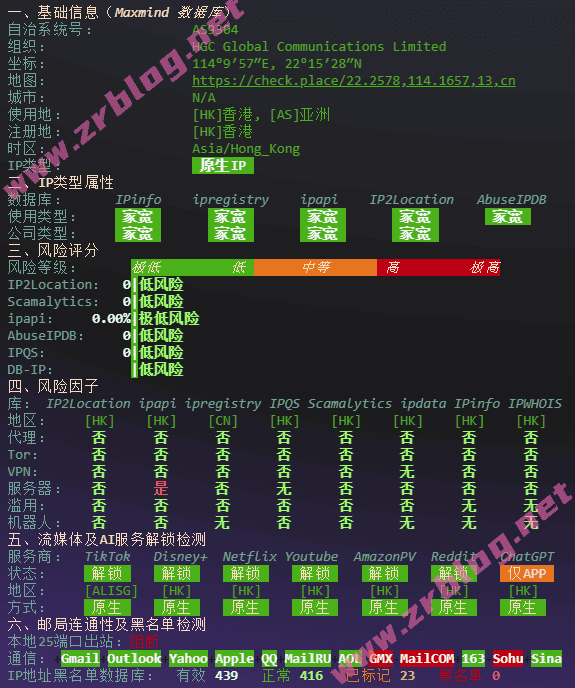 IP信息:香港原生IP,家宽属性,解锁丰富,IP干净