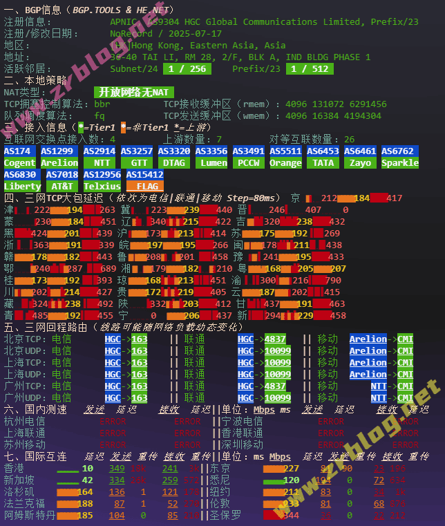 北京 电信 HGC -> 163 地理路径:香港 -> 北京 自治系统路径:AS23532 -> AS9304 -> AS4134 -> AS4847 1 0.57ms 96.62.*.* AS23532 中国 香港 iovz.net 2 1.44ms 218.189.*.* AS9304 [HGCGLOBAL-HK] 中国 香港 hgc-intl.com 3 2.07ms 10.2.*.* * RFC1918 4 159.11ms 202.97.*.* AS4134 [CHINANET-BB] 中国 香港 chinatelecom.com.cn 电信 5-7 184.19ms 202.97.*.* AS4134 [CHINANET-BB] 中国 北京 X-I chinatelecom.com.cn 电信 9 186.77ms 219.141.*.* AS4847 [CHINATELECOM-BJ] 中国 北京 bj.189.cn 10 192.17ms 36.112.*.* AS4847 中国 北京 bj.189.cn 12 224.87ms 106.37.*.* AS4847 [CHINANET-HN] 中国 北京 bj.189.cn 上海 电信 HGC -> 163 地理路径:香港 -> 上海 自治系统路径:AS23532 -> AS9304 -> AS4134 -> AS4812 1 0.49ms 96.62.*.* AS23532 中国 香港 iovz.net 2 1.79ms 218.189.*.* AS9304 [HGCGLOBAL-HK] 中国 香港 hgc-intl.com 3 2.41ms 10.2.*.* * RFC1918 4 158.76ms 202.97.*.* AS4134 [CHINANET-BB] 中国 香港 chinatelecom.com.cn 电信 5-6 179.20ms 202.97.*.* AS4134 [CHINANET-BB] 中国 上海 X-I chinatelecom.com.cn 电信 8 172.93ms 101.95.*.* AS4812 [CHINANET-SH] 中国 上海 chinatelecom.cn 电信 14 161.61ms 101.226.*.* AS4812 [CHINANET-SH] 中国 上海市 chinatelecom.cn 电信 广东 电信 HGC -> 163 地理路径:香港 -> 广东 自治系统路径:AS23532 -> AS9304 -> AS4134 1 0.72ms 96.62.*.* AS23532 中国 香港 iovz.net 2 1.65ms 218.189.*.* AS9304 [HGCGLOBAL-HK] 中国 香港 hgc-intl.com 3 2.37ms 10.2.*.* * RFC1918 4 158.93ms 202.97.*.* AS4134 [CHINANET-BB] 中国 香港 chinatelecom.com.cn 电信 5-7 157.08ms 202.97.*.* AS4134 [CHINANET-BB] 中国 广东 广州 chinatelecom.com.cn 电信 10 159.32ms 14.18.*.* AS4134 中国 广东 广州 chinatelecom.com.cn 电信 14 167.99ms 183.47.*.* AS4134 [APNIC-AP] 中国 广东省 广州市 chinatelecom.com.cn 电信