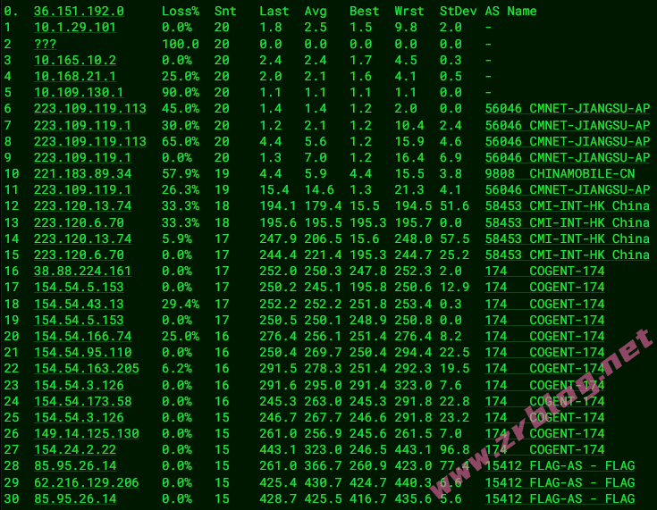 北京 移动 Arelion -> CMI 地理路径:香港 -> 日本 -> 美国 -> 北京 自治系统路径:AS23532 -> AS9304 -> AS15412 -> AS1299 -> AS58453 -> AS9808 -> AS56048 1 0.53ms 96.62.*.* AS23532 中国 香港 iovz.net 2 1.37ms 218.189.*.* AS9304 [HGCGLOBAL-HK] 中国 香港 hgc-intl.com 3 1.94ms 10.2.*.* * RFC1918 4 4.04ms 62.216.*.* AS15412 中国 香港 flagtel.com 5 52.89ms 62.216.*.* AS15412 日本 东京都 东京 flagtel.com 6 159.28ms 62.216.*.* AS15412 美国 加利福尼亚 洛杉矶 flagtel.com 7 152.92ms 213.248.*.* AS1299 [TELIANET] 美国 加利福尼亚 洛杉矶 arelion.com 8 232.76ms 62.115.*.* AS1299 [ARELION-NET] 美国 加利福尼亚 洛杉矶 arelion.com 9-10 232.36ms 223.120.*.* AS58453 [CMI-INT] 美国 加利福尼亚 洛杉矶 cmi.chinamobile.com 移动 11-12 397.72ms 221.183.*.* AS9808 [CMNET] 中国 北京 X-I chinamobileltd.com 移动 16-18 408.34ms 211.136.*.* AS56048 [CMNET] 中国 北京 bj.10086.cn 移动 20 417.54ms 211.136.*.* AS56048 [CMNET] 中国 北京 bj.10086.cn 移动 上海 移动 Arelion -> CMI 地理路径:香港 -> 日本 -> 美国 -> 上海 自治系统路径:AS23532 -> AS9304 -> AS15412 -> AS1299 -> AS58453 -> AS9808 1 0.77ms 96.62.*.* AS23532 中国 香港 iovz.net 2 1.40ms 218.189.*.* AS9304 [HGCGLOBAL-HK] 中国 香港 hgc-intl.com 3 1.68ms 10.2.*.* * RFC1918 4 2.46ms 62.216.*.* AS15412 中国 香港 flagtel.com 5 53.05ms 62.216.*.* AS15412 日本 东京都 东京 flagtel.com 6 159.04ms 62.216.*.* AS15412 美国 加利福尼亚 洛杉矶 flagtel.com 7 150.82ms 213.248.*.* AS1299 [TELIANET] 美国 加利福尼亚 洛杉矶 arelion.com 8-9 159.58ms 62.115.*.* AS1299 [ARELION-NET] 美国 加利福尼亚 洛杉矶 arelion.com 10-11 157.40ms 62.115.*.* AS1299 [ARELION-NET] 美国 华盛顿 西雅图 arelion.com 12-13 254.80ms 223.120.*.* AS58453 [CMI-INT] 美国 华盛顿州 西雅图 cmi.chinamobile.com 移动 14 422.21ms 223.120.*.* AS58453 [CMI-INT] 中国 上海 cmi.chinamobile.com 移动 15-17 423.31ms 221.183.*.* AS9808 [CMNET] 中国 上海 I-C chinamobileltd.com 移动 22 420.25ms 117.185.*.* AS9808 [CMNET] 中国 上海市 chinamobileltd.com 移动 广东 移动 NTT -> CMI 地理路径:香港 -> 广东 自治系统路径:AS23532 -> AS9304 -> AS2914 -> AS58453 -> AS9808 -> AS56040 1 0.58ms 96.62.*.* AS23532 中国 香港 iovz.net 2 1.34ms 218.189.*.* AS9304 [HGCGLOBAL-HK] 中国 香港 hgc-intl.com 3 2.30ms 10.2.*.* * RFC1918 5 2.85ms 203.131.*.* AS2914 [NTT-GLOBAL] 中国 香港 gin.ntt.net 6-7 2.79ms 129.250.*.* AS2914 [NTT-BACKBONE] 中国 香港 gin.ntt.net 10 225.62ms 223.120.*.* AS58453 [CMI-INT] 中国 广东 广州 cmi.chinamobile.com 移动 11-14 237.13ms 221.183.*.* AS9808 [CMNET] 中国 广东 广州 X-I chinamobileltd.com 移动 15-18 246.85ms 183.235.*.* AS56040 [APNIC-AP] 中国 广东 广州 gd.10086.cn 移动 21 260.68ms 211.139.*.* AS56040 [CMNET] 中国 广东 广州 gd.10086.cn 移动