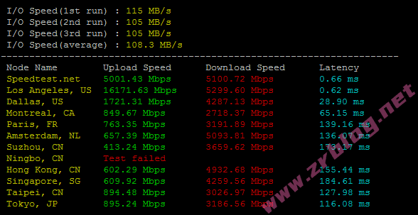 bench一键包磁盘IO和带宽信息,I/O下单过程中可以看到限制100MiB/s,实测在108MB/s左右