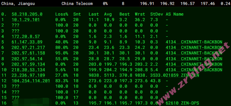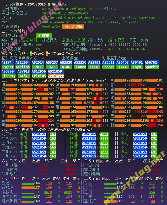 北京 电信 AS21859 -> 163 地理路径:美国 -> 北京 自治系统路径:AS21859 -> AS4134 -> AS4847 2-4 0.88ms 10.5.*.* * RFC1918 6-7 1.47ms 23.236.*.* AS21859 美国 加利福尼亚 洛杉矶 zenlayer.com 8-10 189.81ms 202.97.*.* AS4134 [CHINANET-BB] 中国 北京 chinatelecom.com.cn 电信 11-12 190.94ms 36.112.*.* AS4847 中国 北京 bj.189.cn 13-14 185.37ms 219.141.*.* AS4847 [CHINATELECOM-BJ] 中国 北京 bj.189.cn 15 189.34ms 106.37.*.* AS4847 [CHINANET-HN] 中国 北京 bj.189.cn 上海 电信 AS21859 -> 163 地理路径:美国 -> 上海 自治系统路径:AS21859 -> AS4134 -> AS4812 2-4 0.74ms 10.5.*.* * RFC1918 6-7 0.75ms 23.236.*.* AS21859 美国 加利福尼亚州 洛杉矶 zenlayer.com 8 3.34ms 218.30.*.* AS4134 [CHINANET-US] 美国 加利福尼亚 洛杉矶 ZenLayer-CT-PoP chinatelecom.com.cn 电信 9-11 169.94ms 202.97.*.* AS4134 [CHINANET-BB] 中国 上海 chinatelecom.com.cn 电信 17 188.63ms 101.226.*.* AS4812 [CHINANET-SH] 中国 上海市 chinatelecom.cn 电信 广东 电信 AS21859 -> 163 地理路径:美国 -> 广东 自治系统路径:AS21859 -> AS4134 2-4 0.53ms 10.5.*.* * RFC1918 6 1.04ms 23.236.*.* AS21859 美国 加利福尼亚州 洛杉矶 zenlayer.com 7-8 1.39ms 218.30.*.* AS4134 [CHINANET-US] 美国 加利福尼亚 洛杉矶 ZenLayer-CT-PoP chinatelecom.com.cn 电信 9-11 158.39ms 202.97.*.* AS4134 [CHINANET-BB] 中国 广东 广州 chinatelecom.com.cn 电信 17 163.57ms 183.47.*.* AS4134 [APNIC-AP] 中国 广东省 广州市 chinatelecom.com.cn 电信