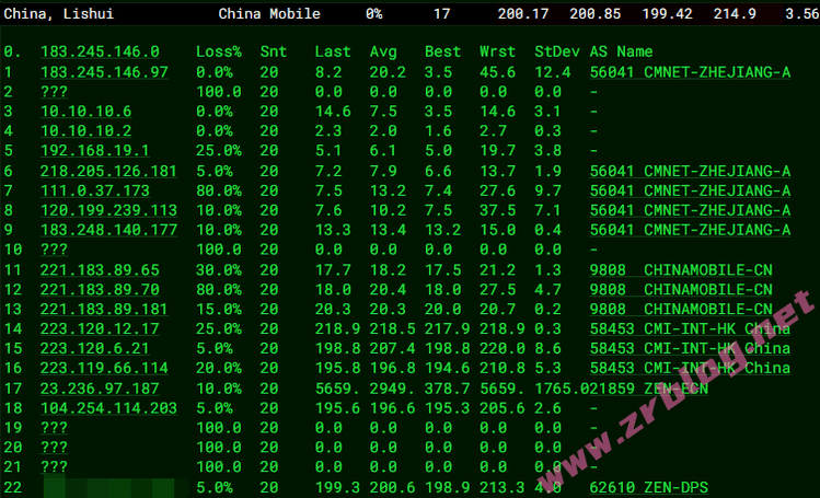 北京 移动 AS21859 -> CMI 地理路径:美国 -> 北京 自治系统路径:AS21859 -> AS58453 -> AS9808 -> AS56048 2-4 0.39ms 10.5.*.* * RFC1918 6-7 0.82ms 23.236.*.* AS21859 美国 加利福尼亚州 洛杉矶 zenlayer.com 8-10 1.12ms 223.120.*.* AS58453 [CMI-INT] 美国 加利福尼亚 洛杉矶 cmi.chinamobile.com 移动 11-12 189.71ms 221.183.*.* AS9808 [CMNET] 中国 北京 I-C chinamobileltd.com 移动 15-18 217.85ms 211.136.*.* AS56048 [CMNET] 中国 北京 bj.10086.cn 移动 19 194.08ms 211.136.*.* AS56048 [CMNET] 中国 北京 bj.10086.cn 移动 上海 移动 AS21859 -> CMI 地理路径:美国 -> 上海 自治系统路径:AS21859 -> AS58453 -> AS9808 2-4 0.78ms 10.5.*.* * RFC1918 6 0.99ms 23.236.*.* AS21859 美国 加利福尼亚州 洛杉矶 zenlayer.com 7-9 1.45ms 223.119.*.* AS58453 [CMI-INT] 美国 加利福尼亚 洛杉矶 cmi.chinamobile.com 移动 10-13 199.45ms 221.183.*.* AS9808 [CMNET] 中国 上海 X-I chinamobileltd.com 移动 16 204.28ms 117.185.*.* AS9808 [CMNET] 中国 上海市 chinamobileltd.com 移动 广东 移动 AS21859 -> CMI 地理路径:美国 -> 广东 自治系统路径:AS21859 -> AS58453 -> AS9808 -> AS56040 2-4 0.39ms 10.5.*.* * RFC1918 6-7 0.78ms 23.236.*.* AS21859 美国 加利福尼亚州 洛杉矶 zenlayer.com 8-9 1.22ms 223.119.*.* AS58453 [CMI-INT] 美国 加利福尼亚 洛杉矶 cmi.chinamobile.com 移动 10 142.57ms 223.120.*.* AS58453 [CMI-INT] 中国 广东 广州 cmi.chinamobile.com 移动 11-14 176.75ms 221.183.*.* AS9808 [CMNET] 中国 广东 广州 I-C chinamobileltd.com 移动 15-16 195.59ms 211.136.*.* AS56040 [CMNET] 中国 广东 广州 gd.10086.cn 移动 17-18 197.27ms 120.198.*.* AS56040 [APNIC-AP] 中国 广东 广州 gd.10086.cn 移动 21 199.19ms 211.139.*.* AS56040 [CMNET] 中国 广东 广州 gd.10086.cn 移动