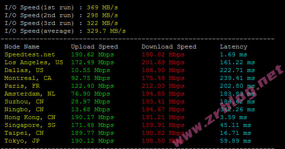 bench一键包磁盘IO和带宽信息:I/O大概在329MB/s的样子