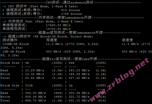 CPU跑分、内存和磁盘dd/fio读写测试结果: