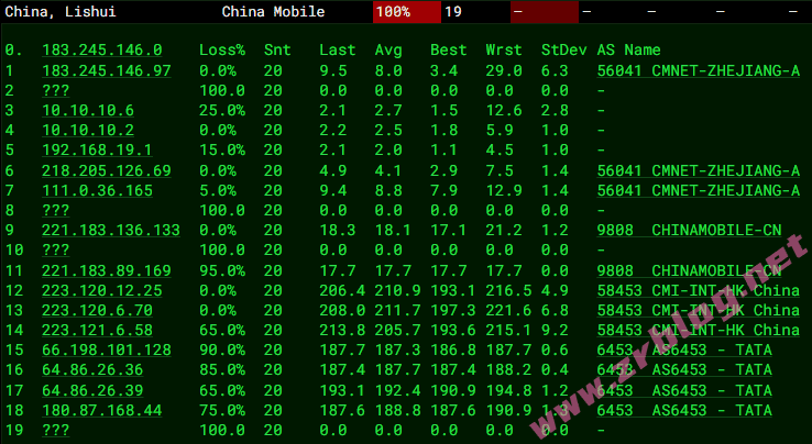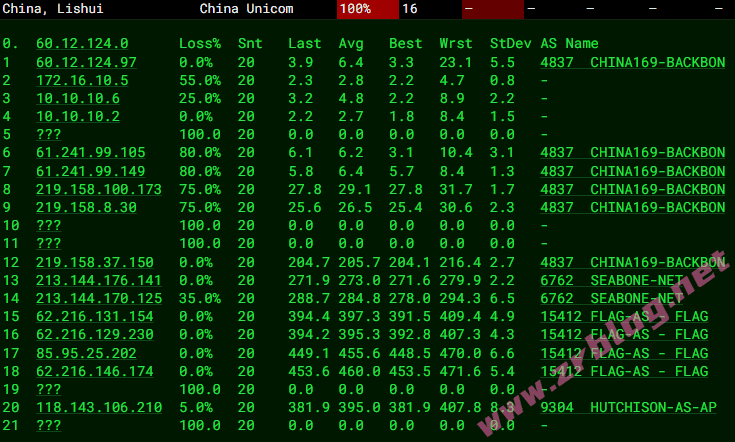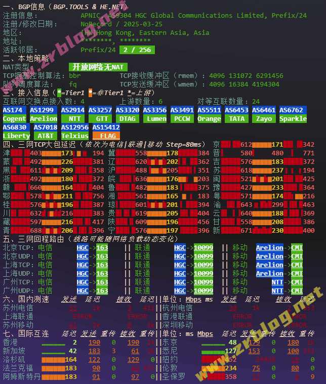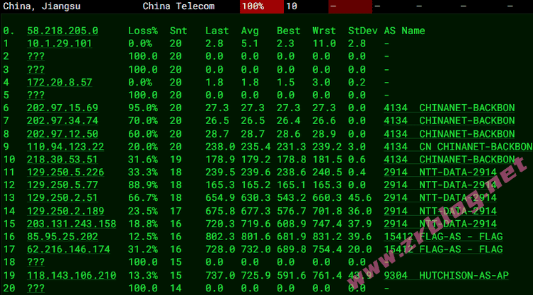 北京 电信 HGC -> 163 地理路径:香港 -> 北京 自治系统路径:AS23532 -> AS9304 -> AS4134 -> AS4847 1 0.31ms 96.62.*.* AS23532 中国 香港 iovz.net 2 1.35ms 218.189.*.* AS9304 [HGCGLOBAL-HK] 中国 香港 hgc-intl.com 3 2.68ms 10.2.*.* * RFC1918 4 326.66ms 202.97.*.* AS4134 [CHINANET-BB] 中国 香港 chinatelecom.com.cn 电信 5-6 167.35ms 202.97.*.* AS4134 [CHINANET-BB] 中国 北京 chinatelecom.com.cn 9 521.31ms 219.141.*.* AS4847 [CHINATELECOM-BJ] 中国 北京 bj.189.cn 10 572.99ms 36.112.*.* AS4847 中国 北京 bj.189.cn 12 330.67ms 106.37.*.* AS4847 [CHINANET-HN] 中国 北京 bj.189.cn 上海 电信 HGC -> 163 地理路径:香港 -> 上海 自治系统路径:AS23532 -> AS9304 -> AS4134 -> AS4812 1 0.45ms 96.62.*.* AS23532 中国 香港 iovz.net 2 1.32ms 218.189.*.* AS9304 [HGCGLOBAL-HK] 中国 香港 hgc-intl.com 3 2.68ms 10.2.*.* * RFC1918 4 339.13ms 202.97.*.* AS4134 [CHINANET-BB] 中国 香港 chinatelecom.com.cn 电信 6-7 668.98ms 202.97.*.* AS4134 [CHINANET-BB] 中国 上海 chinatelecom.com.cn 电信 14 318.67ms 101.226.*.* AS4812 [CHINANET-SH] 中国 上海市 chinatelecom.cn 电信 广东 电信 HGC -> 163 地理路径:香港 -> 广东 自治系统路径:AS23532 -> AS9304 -> AS4134 1 0.66ms 96.62.*.* AS23532 中国 香港 iovz.net 2 1.55ms 218.189.*.* AS9304 [HGCGLOBAL-HK] 中国 香港 hgc-intl.com 3 2.04ms 10.2.*.* * RFC1918 4 220.26ms 202.97.*.* AS4134 [CHINANET-BB] 中国 香港 chinatelecom.com.cn 电信 5-7 155.05ms 202.97.*.* AS4134 [CHINANET-BB] 中国 广东 广州 chinatelecom.com.cn 14 609.96ms 183.47.*.* AS4134 [APNIC-AP] 中国 广东省 广州市 chinatelecom.com.cn 电信