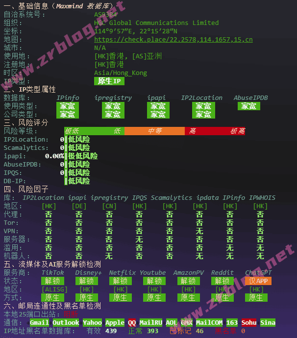 IP信息:香港原生IP,解锁优秀,IP干净,家宽属性