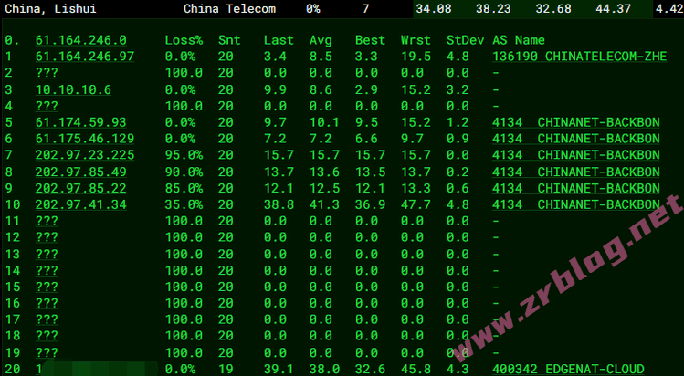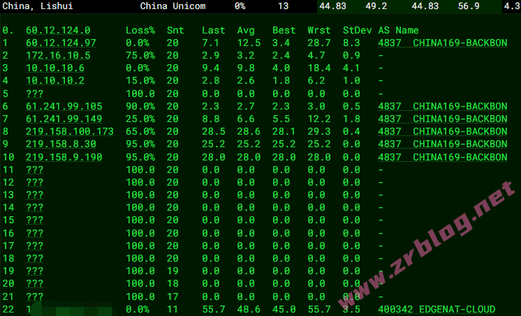 北京 联通 AS9318 -> 4837 地理路径:韩国 -> 北京 自治系统路径:AS9232 -> AS9318 -> AS4837 -> AS4808 1 4.19ms 112.196.*.* AS9232 [APNIC-AP] 韩国 龙山洞 2-5 1.67ms 10.1.*.* * RFC1918 6 1.14ms 39.120.*.* AS9318 [broadNnet] 韩国 首尔特别市 首尔 skbroadband.com 11-12 32.02ms 219.158.*.* AS4837 [CU169-BACKBONE] 中国 北京 chinaunicom.cn 联通 15 35.14ms 125.33.*.* AS4808 [UNICOM-BJ] 中国 北京 通州 www.bbn.com.cn 19 46.83ms 221.222.*.* AS4808 [UNICOM-BJ] 中国 北京 海淀 www.bbn.com.cn 上海 联通 AS9318 -> 4837 地理路径:韩国 -> 上海 自治系统路径:AS9232 -> AS9318 -> AS4837 -> AS140979 1 4.05ms 112.196.*.* AS9232 [APNIC-AP] 韩国 龙山洞 2-5 1.62ms 10.1.*.* * RFC1918 6 1.00ms 39.120.*.* AS9318 [broadNnet] 韩国 首尔特别市 首尔 skbroadband.com 10-11 38.30ms 219.158.*.* AS4837 [CU169-BACKBONE] 中国 上海 chinaunicom.cn 联通 19 39.04ms 58.246.*.* AS140979 中国 上海市 chinaunicom.cn 联通 广东 联通 AS9318 -> 4837 地理路径:韩国 -> 上海 -> 广东 自治系统路径:AS9232 -> AS9318 -> AS4837 -> AS17816 -> AS136958 1 11.70ms 112.196.*.* AS9232 [APNIC-AP] 韩国 龙山洞 2-5 1.81ms 10.1.*.* * RFC1918 6 0.94ms 39.120.*.* AS9318 [broadNnet] 韩国 首尔特别市 首尔 skbroadband.com 10-12 38.39ms 219.158.*.* AS4837 [CU169-BACKBONE] 中国 上海 chinaunicom.cn 联通 13 57.05ms 219.158.*.* AS4837 [CU169-BACKBONE] 中国 广东 广州 chinaunicom.cn 联通 14 57.72ms 120.83.*.* AS17816 [APNIC-AP] 中国 广东 广州 中国联通 联通 20 56.36ms 157.148.*.* AS136958 [UNICOM-GD] 中国 广东省 广州市 chinaunicom.cn 联通