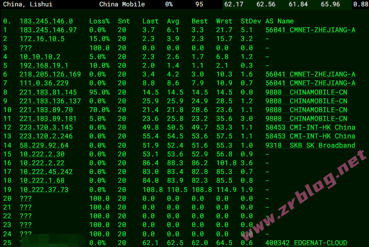 北京 移动 AS9318 -> CMI 地理路径:韩国 -> 日本 -> 北京 自治系统路径:AS9232 -> AS9318 -> AS58453 1 6.29ms 112.196.*.* AS9232 [APNIC-AP] 韩国 龙山洞 2-5 9.64ms 10.1.*.* * RFC1918 6 2.01ms 39.120.*.* AS9318 [broadNnet] 韩国 首尔特别市 首尔 skbroadband.com 12 32.76ms 223.120.*.* AS58453 [CMI-INT] 日本 东京都 东京 cmi.chinamobile.com 移动 13 83.87ms 223.120.*.* AS58453 [CMI-INT] 中国 北京 cmi.chinamobile.com 移动 上海 移动 AS9318 -> CMI 地理路径:韩国 -> 日本 -> 上海 自治系统路径:AS9232 -> AS9318 -> AS58453 -> AS9808 1 18.01ms 112.196.*.* AS9232 [APNIC-AP] 韩国 龙山洞 2-5 1.69ms 10.1.*.* * RFC1918 6 1.23ms 39.120.*.* AS9318 [broadNnet] 韩国 首尔特别市 首尔 skbroadband.com 12 34.14ms 223.120.*.* AS58453 [CMI-INT] 日本 东京都 东京 cmi.chinamobile.com 移动 13 63.24ms 223.120.*.* AS58453 [CMI-INT] 中国 上海 cmi.chinamobile.com 移动 14-16 65.87ms 221.183.*.* AS9808 [CMNET] 中国 上海 X-I chinamobileltd.com 移动 20 68.93ms 117.185.*.* AS9808 [CMNET] 中国 上海市 chinamobileltd.com 移动 广东 移动 AS9318 -> CMI 地理路径:韩国 -> 日本 -> 广东 自治系统路径:AS9232 -> AS9318 -> AS58453 -> AS9808 -> AS56040 1 5.69ms 112.196.*.* AS9232 [APNIC-AP] 韩国 龙山洞 2-5 1.75ms 10.1.*.* * RFC1918 6 1.16ms 39.120.*.* AS9318 [broadNnet] 韩国 首尔特别市 首尔 skbroadband.com 12 32.81ms 223.120.*.* AS58453 [CMI-INT] 日本 东京都 东京 cmi.chinamobile.com 移动 13 98.30ms 223.120.*.* AS58453 [CMI-INT] 中国 广东 广州 cmi.chinamobile.com 14-16 90.24ms 221.183.*.* AS9808 [CMNET] 中国 广东 广州 X-I chinamobileltd.com 移动 18 100.08ms 211.136.*.* AS56040 [CMNET] 中国 广东 广州 gd.10086.cn 移动 19-21 116.02ms 183.235.*.* AS56040 [APNIC-AP] 中国 广东 广州 gd.10086.cn 移动 25 111.23ms 211.139.*.* AS56040 [CMNET] 中国 广东 广州 gd.10086.cn 移动