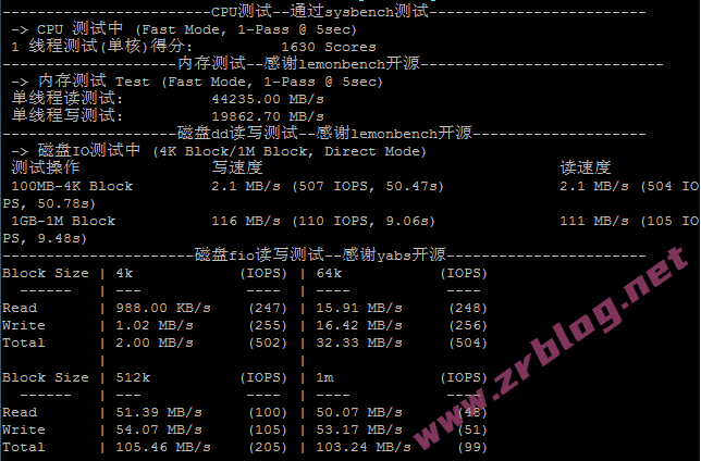 CPU跑分、内存和磁盘dd/fio读写测试结果:
