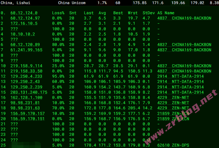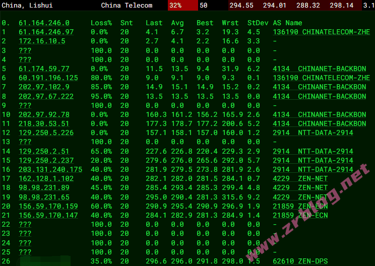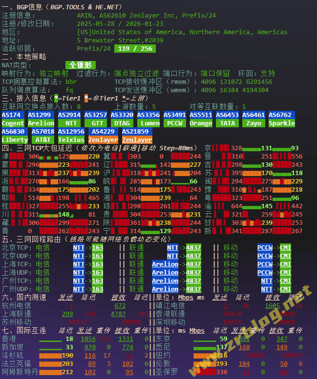 北京 电信 NTT -> 163 地理路径:菲律宾 -> 越南 -> 香港 -> 上海 -> 北京 自治系统路径:AS21859 -> AS4229 -> AS2914 -> AS4134 -> AS4847 2-5 0.47ms 10.24.*.* * RFC1918 6-7 0.59ms 156.59.*.* AS21859 [ZEN-SG] 菲律宾 马尼拉大都会 马尼拉 zenlayer.com 8-9 0.60ms 98.98.*.* AS4229 越南 河内市 zenlayer.com 10 18.37ms 162.128.*.* AS4229 中国 香港 zenlayer.com 11 18.24ms 203.131.*.* AS2914 [NTT-GLOBAL] 中国 香港 gin.ntt.net 12 21.37ms 129.250.*.* AS2914 [NTT-BACKBONE] 中国 香港 gin.ntt.net 16 267.16ms 202.97.*.* AS4134 [CHINANET-BB] 中国 上海 chinatelecom.com.cn 电信 17 291.60ms 202.97.*.* AS4134 [CHINANET-BB] 中国 北京 chinatelecom.com.cn 电信 19 294.92ms 36.112.*.* AS4847 中国 北京 bj.189.cn 20-21 288.66ms 219.141.*.* AS4847 [CHINATELECOM-BJ] 中国 北京 bj.189.cn 22 287.48ms 106.37.*.* AS4847 [CHINANET-HN] 中国 北京 bj.189.cn 上海 电信 NTT -> 163 地理路径:菲律宾 -> 越南 -> 香港 -> 上海 自治系统路径:AS21859 -> AS4229 -> AS2914 -> AS4134 -> AS4812 2-5 0.25ms 10.24.*.* * RFC1918 6-7 0.75ms 156.59.*.* AS21859 [ZEN-SG] 菲律宾 马尼拉大都会 马尼拉 zenlayer.com 8-9 0.53ms 98.98.*.* AS4229 越南 河内市 zenlayer.com 10 18.16ms 162.128.*.* AS4229 中国 香港 zenlayer.com 11 18.34ms 203.131.*.* AS2914 [NTT-GLOBAL] 中国 香港 gin.ntt.net 12 18.97ms 129.250.*.* AS2914 [NTT-BACKBONE] 中国 香港 gin.ntt.net 16 291.54ms 202.97.*.* AS4134 [CHINANET-BB] 中国 上海 chinatelecom.com.cn 电信 17 271.30ms 101.95.*.* AS4812 [CHINANET-SH] 中国 上海 chinatelecom.cn 电信 23 285.04ms 101.226.*.* AS4812 [CHINANET-SH] 中国 上海市 chinatelecom.cn 电信 广东 电信 NTT -> 163 地理路径:菲律宾 -> 越南 -> 香港 -> 美国 -> 广东 自治系统路径:AS21859 -> AS4229 -> AS2914 -> AS4134 2-5 0.37ms 10.24.*.* * RFC1918 6-7 1.11ms 156.59.*.* AS21859 [ZEN-SG] 菲律宾 马尼拉大都会 马尼拉 zenlayer.com 8-9 0.72ms 98.98.*.* AS4229 越南 河内市 zenlayer.com 10 18.23ms 162.128.*.* AS4229 中国 香港 zenlayer.com 11 15.95ms 203.131.*.* AS2914 [NTT-GLOBAL] 中国 香港 gin.ntt.net 12 19.17ms 129.250.*.* AS2914 [NTT-BACKBONE] 中国 香港 gin.ntt.net 13 175.92ms 218.30.*.* AS4134 [CHINANET-US] 美国 加利福尼亚 圣克拉拉 chinatelecom.com.cn 电信 15-16 323.75ms 202.97.*.* AS4134 [CHINANET-BB] 中国 广东 广州 chinatelecom.com.cn 19 317.63ms 113.108.*.* AS4134 [CHINANET-GD] 中国 广东省 广州市 chinatelecom.com.cn 电信 23 320.40ms 183.47.*.* AS4134 [APNIC-AP] 中国 广东省 广州市 chinatelecom.com.cn 电信