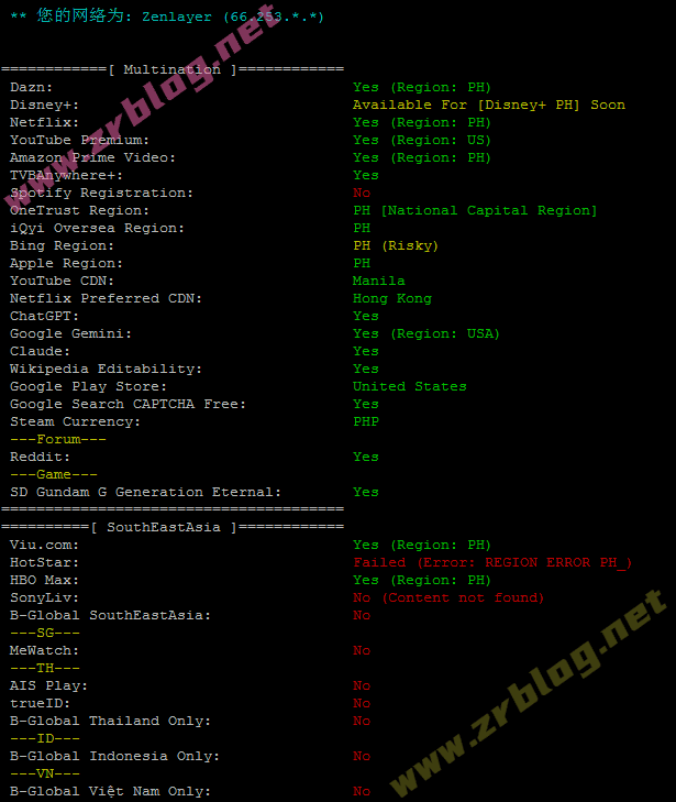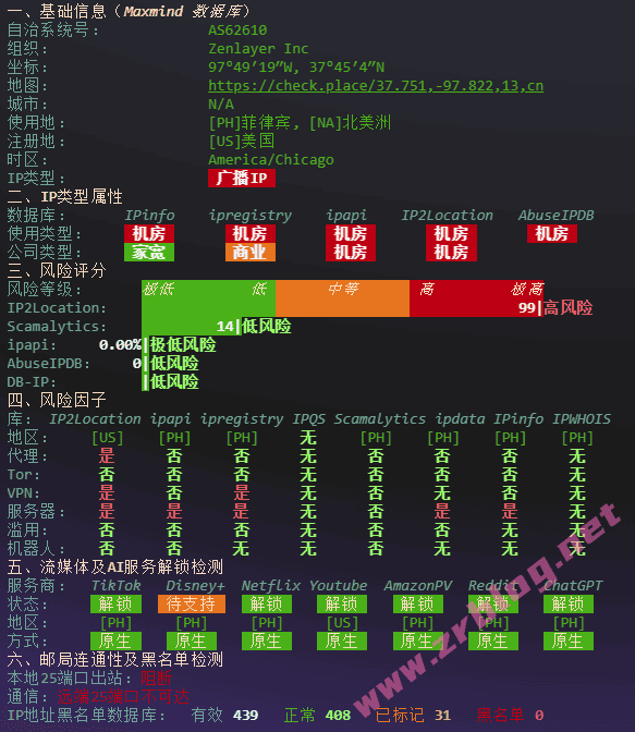 IP信息:广播IP,解锁较多,可以解锁菲律宾TikTok/Netflix/ChatGPT等