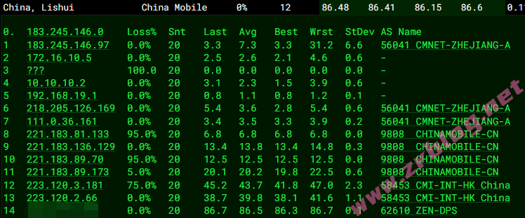 北京 移动 PCCW -> CMI 地理路径:菲律宾 -> 越南 -> 新加坡 -> 北京 自治系统路径:AS21859 -> AS4229 -> AS3491 -> AS58453 -> AS9808 -> AS56048 2-5 0.42ms 10.24.*.* * RFC1918 6-7 0.62ms 156.59.*.* AS21859 [ZEN-SG] 菲律宾 马尼拉大都会 马尼拉 zenlayer.com 8-9 0.66ms 98.98.*.* AS4229 越南 河内市 zenlayer.com 10 15.96ms 162.128.*.* AS4229 新加坡 zenlayer.com 11 16.54ms 63.220.*.* AS3491 新加坡 pccwglobal.com 12 40.11ms 63.223.*.* AS3491 [PCCW-BACKBONE] 新加坡 pccwglobal.com 13-14 46.36ms 223.121.*.* AS58453 [CMI-INT] 新加坡 cmi.chinamobile.com 移动 16-19 91.78ms 221.183.*.* AS9808 [CMNET] 中国 北京 X-I chinamobileltd.com 移动 20-24 97.13ms 211.136.*.* AS56048 [CMNET] 中国 北京 bj.10086.cn 移动 25 96.06ms 211.136.*.* AS56048 [CMNET] 中国 北京 bj.10086.cn 移动 上海 移动 PCCW -> CMI 地理路径:菲律宾 -> 越南 -> 新加坡 -> 美国 -> 上海 自治系统路径:AS21859 -> AS4229 -> AS3491 -> AS58453 -> AS9808 2-5 0.28ms 10.24.*.* * RFC1918 6-7 0.56ms 156.59.*.* AS21859 [ZEN-SG] 菲律宾 马尼拉大都会 马尼拉 zenlayer.com 8-9 0.85ms 98.98.*.* AS4229 越南 河内市 zenlayer.com 10 18.40ms 162.128.*.* AS4229 新加坡 zenlayer.com 12-13 166.06ms 63.223.*.* AS3491 [PCCW-BACKBONE] 美国 加利福尼亚 洛杉矶 pccwglobal.com 14 178.10ms 63.220.*.* AS3491 美国 加利福尼亚 洛杉矶 pccwglobal.com 15 171.50ms 223.120.*.* AS58453 [CMI-INT] 美国 加利福尼亚 洛杉矶 cmi.chinamobile.com 移动 16 213.64ms 223.120.*.* AS58453 [CMI-INT] 中国 上海 cmi.chinamobile.com 移动 17-19 202.67ms 221.183.*.* AS9808 [CMNET] 中国 上海 X-I chinamobileltd.com 移动 24 202.76ms 117.185.*.* AS9808 [CMNET] 中国 上海市 chinamobileltd.com 移动 广东 移动 NTT -> CMI 地理路径:菲律宾 -> 新加坡 -> 广东 自治系统路径:AS21859 -> AS4229 -> AS2914 -> AS58453 -> AS9808 -> AS56040 2-5 0.28ms 10.24.*.* * RFC1918 6-7 0.78ms 156.59.*.* AS21859 [ZEN-SG] 菲律宾 马尼拉大都会 马尼拉 zenlayer.com 8 0.64ms 162.128.*.* AS4229 菲律宾 马尼拉大都会 马尼拉 zenlayer.com 9-10 30.26ms 162.128.*.* AS4229 新加坡 zenlayer.com 11 31.65ms 116.51.*.* AS2914 [NTT-GIN] 新加坡 gin.ntt.net 12 361.34ms 129.250.*.* AS2914 [NTT-BACKBONE] 新加坡 gin.ntt.net 15 53.99ms 223.120.*.* AS58453 [CMI-INT] 中国 广东 广州 cmi.chinamobile.com 移动 16-19 48.73ms 221.183.*.* AS9808 [CMNET] 中国 广东 广州 X-I chinamobileltd.com 移动 20-23 77.73ms 183.235.*.* AS56040 [APNIC-AP] 中国 广东 广州 gd.10086.cn 移动 27 93.43ms 211.139.*.* AS56040 [CMNET] 中国 广东 广州 gd.10086.cn 移动