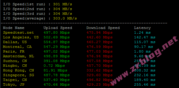bench一键包磁盘IO和带宽信息:I/O大概在303MB/s的样子
