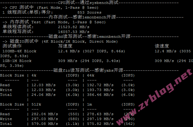 CPU跑分、内存和磁盘dd/fio读写测试结果: