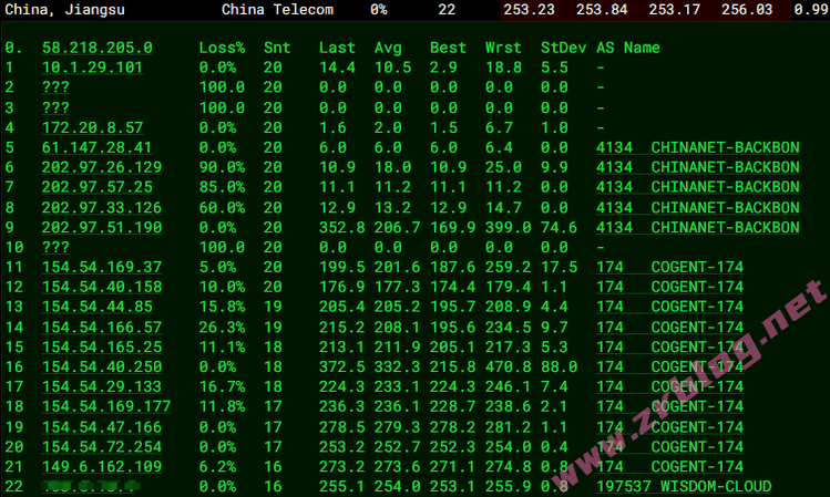 北京 电信 Cogent -> 163 地理路径:法国 -> 德国 -> 北京 自治系统路径:AS174 -> AS4134 -> AS4847 2 0.56ms 149.6.*.* AS174 [COGENT-149] 法国 法兰西岛大区 巴黎 cogentco.com 3 1.28ms 154.54.*.* AS174 [COGENT-BONE] 法国 法兰西岛大区 巴黎 cogentco.com 4-5 11.85ms 154.54.*.* AS174 [COGENT-BONE] 德国 黑森 美因河畔法兰克福 cogentco.com 6 11.97ms 149.11.*.* AS174 [COGENT-149] 德国 黑森 美因河畔法兰克福 cogentco.com 8-9 216.16ms 202.97.*.* AS4134 [CHINANET-BB] 中国 北京 I-C chinatelecom.com.cn 电信 11 216.17ms 36.112.*.* AS4847 中国 北京 bj.189.cn 12-13 227.07ms 219.141.*.* AS4847 [CHINATELECOM-BJ] 中国 北京 bj.189.cn 14 223.89ms 106.37.*.* AS4847 [CHINANET-HN] 中国 北京 bj.189.cn 上海 电信 Cogent -> 163 地理路径:法国 -> 德国 -> 上海 自治系统路径:AS174 -> AS4134 -> AS4812 2 1.20ms 149.6.*.* AS174 [COGENT-149] 法国 法兰西岛大区 巴黎 cogentco.com 3 1.54ms 154.54.*.* AS174 [COGENT-BONE] 法国 法兰西岛大区 巴黎 cogentco.com 4-5 11.15ms 154.54.*.* AS174 [COGENT-BONE] 德国 黑森 美因河畔法兰克福 cogentco.com 6 348.48ms 149.11.*.* AS174 [COGENT-149] 德国 黑森 美因河畔法兰克福 cogentco.com 7-9 238.73ms 202.97.*.* AS4134 [CHINANET-BB] 中国 上海 chinatelecom.com.cn 电信 10 249.36ms 101.95.*.* AS4812 [CHINANET-SH] 中国 上海 chinatelecom.cn 电信 16 240.69ms 101.226.*.* AS4812 [CHINANET-SH] 中国 上海市 chinatelecom.cn 电信 广东 电信 Cogent -> 163 地理路径:法国 -> 德国 -> 广东 自治系统路径:AS174 -> AS4134 2 1.17ms 149.6.*.* AS174 [COGENT-149] 法国 法兰西岛大区 巴黎 cogentco.com 3 1.65ms 154.54.*.* AS174 [COGENT-BONE] 法国 法兰西岛大区 巴黎 cogentco.com 4-5 11.28ms 154.54.*.* AS174 [COGENT-BONE] 德国 黑森 美因河畔法兰克福 cogentco.com 6 400.52ms 149.11.*.* AS174 [COGENT-149] 德国 黑森 美因河畔法兰克福 cogentco.com 7-8 244.50ms 202.97.*.* AS4134 [CHINANET-BB] 中国 广东 广州 chinatelecom.com.cn 10 253.83ms 113.96.*.* AS4134 [CHINANET-GD] 中国 广东 广州 chinatelecom.com.cn 电信 16 268.76ms 183.47.*.* AS4134 [APNIC-AP] 中国 广东省 广州市 chinatelecom.com.cn 电信