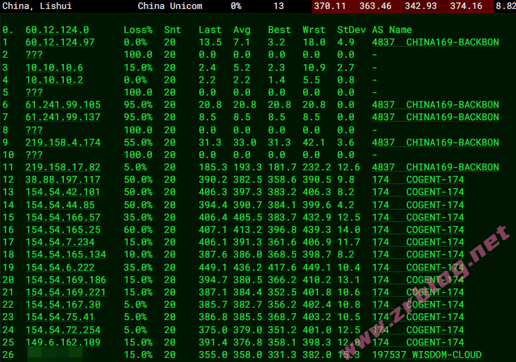 北京 联通 Cogent -> 4837 地理路径:法国 -> 德国 -> 北京 自治系统路径:AS197537 -> AS174 -> AS4837 -> AS4808 1 0.37ms 163.5.*.* AS197537 法国 法兰西岛大区 巴黎 wisdomisp.com 2 0.98ms 149.6.*.* AS174 [COGENT-149] 法国 法兰西岛大区 巴黎 cogentco.com 3 1.49ms 154.54.*.* AS174 [COGENT-BONE] 法国 法兰西岛大区 巴黎 cogentco.com 4-5 10.66ms 154.54.*.* AS174 [COGENT-BONE] 德国 黑森 美因河畔法兰克福 cogentco.com 6 309.73ms 149.11.*.* AS174 [COGENT-149] 德国 黑森州 美因河畔法兰克福 cogentco.com 7-8 306.90ms 219.158.*.* AS4837 [CU169-BACKBONE] 中国 北京 chinaunicom.cn 联通 10 373.17ms 202.96.*.* AS4808 [UNICOM-BJ] 中国 北京 www.bbn.com.cn 联通 11 325.91ms 61.148.*.* AS4808 [UNICOM-CN] 中国 北京 www.bbn.com.cn 15 358.83ms 221.222.*.* AS4808 [UNICOM-BJ] 中国 北京 海淀 www.bbn.com.cn 上海 联通 Cogent -> 4837 地理路径:法国 -> 德国 -> 广东 -> 上海 自治系统路径:AS174 -> AS4837 -> AS140979 2 1.05ms 149.6.*.* AS174 [COGENT-149] 法国 法兰西岛大区 巴黎 cogentco.com 3 1.88ms 154.54.*.* AS174 [COGENT-BONE] 法国 法兰西岛大区 巴黎 cogentco.com 4-5 10.99ms 154.54.*.* AS174 [COGENT-BONE] 德国 黑森 美因河畔法兰克福 cogentco.com 6 252.92ms 149.11.*.* AS174 [COGENT-149] 德国 黑森州 美因河畔法兰克福 cogentco.com 7-8 240.32ms 219.158.*.* AS4837 [CU169-BACKBONE] 中国 广东 广州 chinaunicom.cn 联通 17 367.54ms 112.64.*.* AS140979 [APNIC-AP] 中国 上海市 闵行 chinaunicom.cn 联通 广东 联通 Cogent -> 4837 地理路径:法国 -> 德国 -> 广东 自治系统路径:AS174 -> AS4837 -> AS136958 2 1.17ms 149.6.*.* AS174 [COGENT-149] 法国 法兰西岛大区 巴黎 cogentco.com 3 1.64ms 154.54.*.* AS174 [COGENT-BONE] 法国 法兰西岛大区 巴黎 cogentco.com 4-5 10.94ms 154.54.*.* AS174 [COGENT-BONE] 德国 黑森 美因河畔法兰克福 cogentco.com 6 255.98ms 149.11.*.* AS174 [COGENT-149] 德国 黑森州 美因河畔法兰克福 cogentco.com 7-9 253.48ms 219.158.*.* AS4837 [CU169-BACKBONE] 中国 广东 广州 chinaunicom.cn 联通 16 267.57ms 157.148.*.* AS136958 [UNICOM-GD] 中国 广东省 广州市 chinaunicom.cn 联通