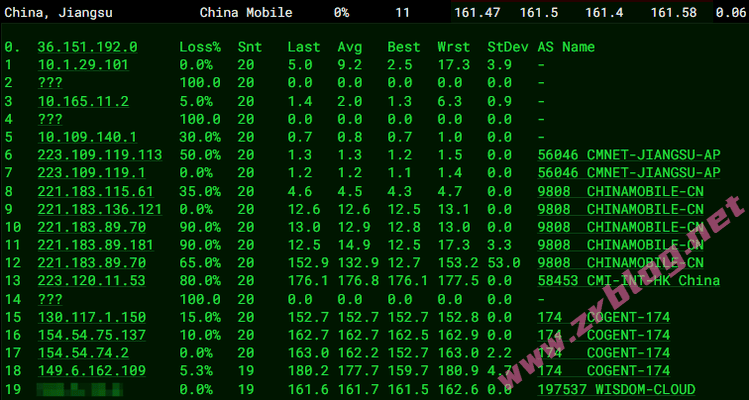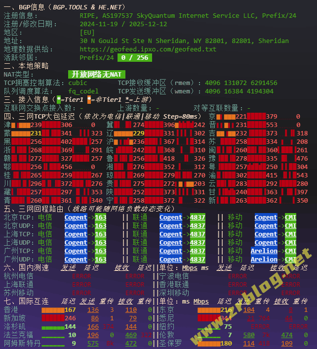 北京 移动 Cogent -> CMI 地理路径:法国 -> 英国 -> 北京 自治系统路径:AS174 -> AS58453 -> AS9808 -> AS56048 2 0.70ms 149.6.*.* AS174 [COGENT-149] 法国 法兰西岛大区 巴黎 cogentco.com 3 1.17ms 154.54.*.* AS174 [COGENT-BONE] 法国 法兰西岛大区 巴黎 cogentco.com 4-5 7.41ms 154.54.*.* AS174 [COGENT-BONE] 英国 英格兰 斯劳 cogentco.com 6 6.68ms 149.14.*.* AS174 [COGENT-149] 英国 伯克郡 斯劳 Cogent-CMI-Peer cogentco.com 7 7.07ms 223.120.*.* AS58453 [CMI-INT] 英国 英格兰 伦敦 cmi.chinamobile.com 移动 8 161.02ms 223.120.*.* AS58453 [CMI-INT] 中国 北京 cmi.chinamobile.com 9-10 160.61ms 221.183.*.* AS9808 [CMNET] 中国 北京 X-I chinamobileltd.com 移动 14-16 163.07ms 211.136.*.* AS56048 [CMNET] 中国 北京 bj.10086.cn 移动 18 164.95ms 211.136.*.* AS56048 [CMNET] 中国 北京 bj.10086.cn 移动 上海 移动 Cogent -> CMI 地理路径:法国 -> 美国 -> 上海 自治系统路径:AS174 -> AS58453 -> AS9808 2 1.14ms 149.6.*.* AS174 [COGENT-149] 法国 法兰西岛大区 巴黎 cogentco.com 3 2.57ms 154.54.*.* AS174 [COGENT-BONE] 法国 法兰西岛大区 巴黎 cogentco.com 4 79.09ms 154.54.*.* AS174 [COGENT-BONE] 美国 华盛顿DC 华盛顿 cogentco.com 5 95.77ms 154.54.*.* AS174 [COGENT-BONE] 美国 佐治亚 亚历山大 cogentco.com 6 103.15ms 154.54.*.* AS174 [COGENT-BONE] 美国 犹他 盐湖城 cogentco.com 7 114.35ms 154.54.*.* AS174 [COGENT-BONE] 美国 德克萨斯 达拉斯 cogentco.com 8 122.48ms 154.54.*.* AS174 [COGENT-BONE] 美国 得克萨斯州 埃尔帕索 cogentco.com 9 153.39ms 154.54.*.* AS174 [COGENT-BONE] 美国 亚利桑那 凤凰城 cogentco.com 10-11 145.37ms 154.54.*.* AS174 [COGENT-BONE] 美国 加利福尼亚 洛杉矶 cogentco.com 12 140.85ms 38.104.*.* AS174 美国 加利福尼亚 洛杉矶 cogentco.com 13 141.04ms 223.120.*.* AS58453 [CMI-INT] 美国 加利福尼亚 洛杉矶 cmi.chinamobile.com 移动 14 254.62ms 223.120.*.* AS58453 [CMI-INT] 中国 上海 cmi.chinamobile.com 移动 15-17 262.66ms 221.183.*.* AS9808 [CMNET] 中国 上海 X-I chinamobileltd.com 移动 21 287.81ms 117.185.*.* AS9808 [CMNET] 中国 上海市 chinamobileltd.com 移动 广东 移动 Arelion -> CMI 地理路径:法国 -> 英国 -> 广东 自治系统路径:AS197537 -> AS174 -> AS1299 -> AS58453 -> AS9808 -> AS56040 1 0.66ms 163.5.*.* AS197537 法国 法兰西岛大区 巴黎 wisdomisp.com 2 1.07ms 149.6.*.* AS174 [COGENT-149] 法国 法兰西岛大区 巴黎 cogentco.com 3 2.09ms 154.54.*.* AS174 [COGENT-BONE] 法国 法兰西岛大区 巴黎 cogentco.com 4-6 9.65ms 154.54.*.* AS174 [COGENT-BONE] 英国 英格兰 伦敦 cogentco.com 7-10 11.43ms 62.115.*.* AS1299 [ARELION-NET] 英国 英格兰 伦敦 arelion.com 11 8.48ms 223.120.*.* AS58453 [CMI-INT] 英国 英格兰 伦敦 cmi.chinamobile.com 移动 12-15 186.28ms 221.183.*.* AS9808 [CMNET] 中国 广东 广州 X-I chinamobileltd.com 移动 17-18 192.62ms 183.235.*.* AS56040 [APNIC-AP] 中国 广东 广州 gd.10086.cn 移动 19 190.50ms 211.136.*.* AS56040 [CMNET] 中国 广东 广州 gd.10086.cn 移动 22 195.81ms 211.139.*.* AS56040 [CMNET] 中国 广东 广州 gd.10086.cn 移动
