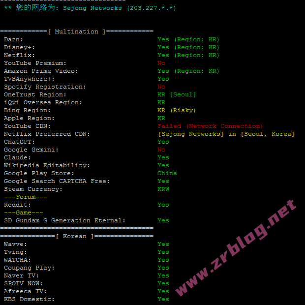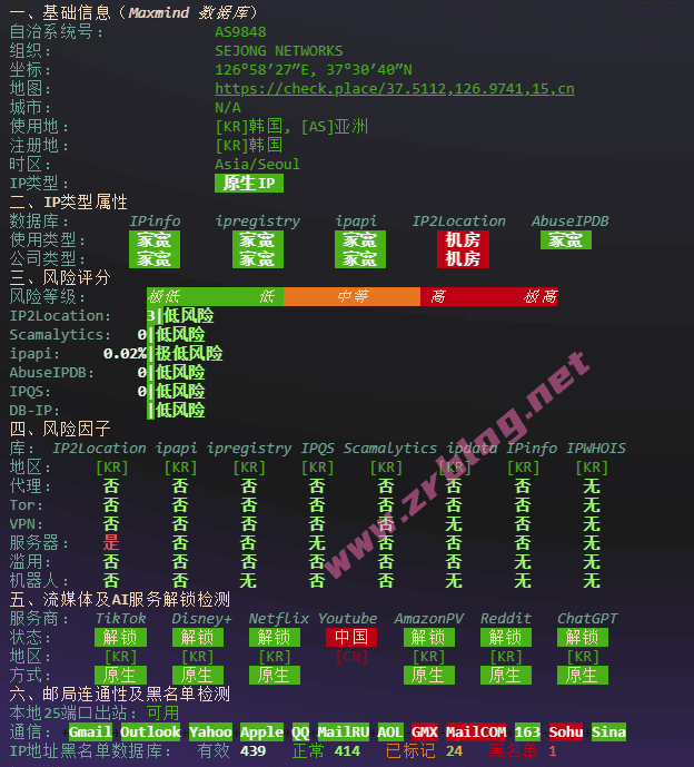 - 韩国双ISP原生IP解锁丰富(不过我开到的这个IP有送中情况),大部分数据库识别为家宽;