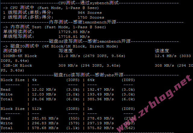 CPU跑分、内存和磁盘dd/fio读写测试结果: