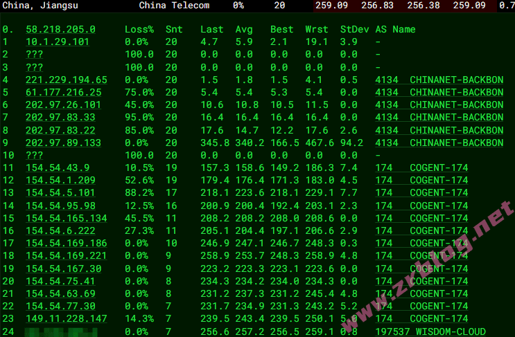 北京 电信 Cogent -> 163 地理路径:德国 -> 北京 自治系统路径:AS197537 -> AS174 -> AS4134 -> AS4847 1 0.25ms 82.139.*.* AS197537 德国 柏林 wisdomisp.com 2 0.94ms 149.11.*.* AS174 [COGENT-149] 德国 黑森 美因河畔法兰克福 cogentco.com 3-4 1.54ms 154.54.*.* AS174 [COGENT-BONE] 德国 黑森 美因河畔法兰克福 cogentco.com 7-8 203.50ms 202.97.*.* AS4134 [CHINANET-BB] 中国 北京 chinatelecom.com.cn 电信 9 210.36ms 124.127.*.* AS4847 [RITELE] 中国 北京市 西城 bj.189.cn 电信 10-11 206.89ms 36.112.*.* AS4847 中国 北京 bj.189.cn 12 213.32ms 219.141.*.* AS4847 [CHINATELECOM-BJ] 中国 北京 bj.189.cn 13 211.70ms 106.37.*.* AS4847 [CHINANET-HN] 中国 北京 bj.189.cn 上海 电信 Cogent -> 163 地理路径:德国 -> 上海 自治系统路径:AS174 -> AS4134 -> AS4812 2 1.21ms 149.11.*.* AS174 [COGENT-149] 德国 黑森 美因河畔法兰克福 cogentco.com 3-4 0.97ms 154.54.*.* AS174 [COGENT-BONE] 德国 黑森 美因河畔法兰克福 cogentco.com 6-8 237.89ms 202.97.*.* AS4134 [CHINANET-BB] 中国 上海 chinatelecom.com.cn 电信 9 265.98ms 101.95.*.* AS4812 [CHINANET-SH] 中国 上海 chinatelecom.cn 电信 15 240.81ms 101.226.*.* AS4812 [CHINANET-SH] 中国 上海市 chinatelecom.cn 电信 广东 电信 Cogent -> 163 地理路径:德国 -> 北京 -> 广东 自治系统路径:AS174 -> AS4134 2 1.37ms 149.11.*.* AS174 [COGENT-149] 德国 黑森 美因河畔法兰克福 cogentco.com 3-4 1.57ms 154.54.*.* AS174 [COGENT-BONE] 德国 黑森 美因河畔法兰克福 cogentco.com 6 238.64ms 202.97.*.* AS4134 [CHINANET-BB] 中国 北京 chinatelecom.com.cn 电信 7-8 248.18ms 202.97.*.* AS4134 [CHINANET-BB] 中国 广东 广州 chinatelecom.com.cn 15 244.01ms 183.47.*.* AS4134 [APNIC-AP] 中国 广东省 广州市 chinatelecom.com.cn 电信