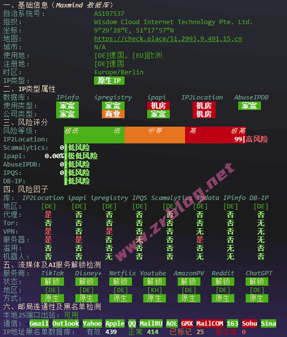 IP信息:德国原生IP,部分数据库识别家宽属性,解锁全绿