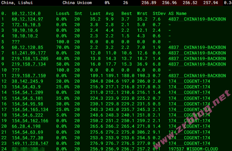北京 联通 Cogent -> 4837 地理路径:德国 -> 北京 自治系统路径:AS174 -> AS4837 -> AS4808 2 0.80ms 149.11.*.* AS174 [COGENT-149] 德国 黑森 美因河畔法兰克福 cogentco.com 3-4 1.68ms 154.54.*.* AS174 [COGENT-BONE] 德国 黑森 美因河畔法兰克福 cogentco.com 6-7 215.52ms 219.158.*.* AS4837 [CU169-BACKBONE] 中国 北京 chinaunicom.cn 联通 9 213.76ms 124.65.*.* AS4808 [UNICOM-BJ] 中国 北京 www.bbn.com.cn 联通 10 213.10ms 61.148.*.* AS4808 [UNICOM-CN] 中国 北京 www.bbn.com.cn 13 241.05ms 221.222.*.* AS4808 [UNICOM-BJ] 中国 北京 海淀 www.bbn.com.cn 上海 联通 Cogent -> 4837 地理路径:德国 -> 广东 -> 上海 自治系统路径:AS174 -> AS4837 -> AS140979 2 0.76ms 149.11.*.* AS174 [COGENT-149] 德国 黑森 美因河畔法兰克福 cogentco.com 3-4 1.24ms 154.54.*.* AS174 [COGENT-BONE] 德国 黑森 美因河畔法兰克福 cogentco.com 6-8 226.67ms 219.158.*.* AS4837 [CU169-BACKBONE] 中国 广东 广州 chinaunicom.cn 联通 16 253.88ms 112.64.*.* AS140979 [APNIC-AP] 中国 上海市 闵行 chinaunicom.cn 联通 广东 联通 Cogent -> 4837 地理路径:德国 -> 广东 自治系统路径:AS174 -> AS4837 -> AS17816 -> AS136958 2 0.80ms 149.11.*.* AS174 [COGENT-149] 德国 黑森 美因河畔法兰克福 cogentco.com 3-4 1.98ms 154.54.*.* AS174 [COGENT-BONE] 德国 黑森 美因河畔法兰克福 cogentco.com 6-7 226.57ms 219.158.*.* AS4837 [CU169-BACKBONE] 中国 广东 广州 chinaunicom.cn 联通 9 266.66ms 120.81.*.* AS17816 [APNIC-AP] 中国 广东 广州 China Unicom IP network China169 Guangdong province 15 268.32ms 157.148.*.* AS136958 [UNICOM-GD] 中国 广东省 广州市 chinaunicom.cn 联通