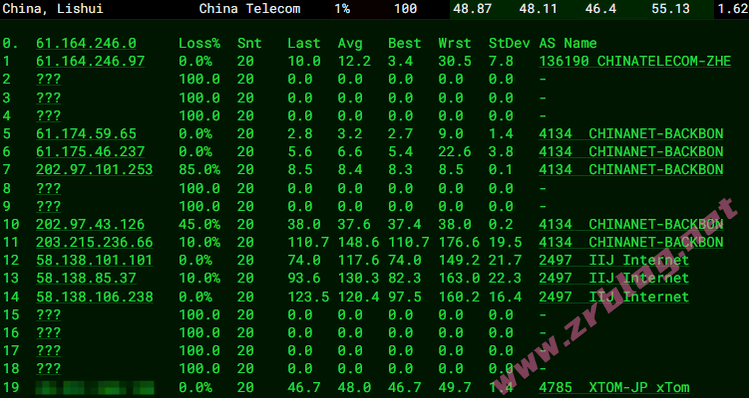 北京 电信 Softbank -> 163 地理路径:日本 -> 上海 -> 北京 自治系统路径:AS4785 -> AS17676 -> AS4134 -> AS4847 -> AS4134 -> AS4847 1 0.64ms 45.251.*.* AS4785 日本 大阪府 大阪市 xtom.com 2-3 0.74ms 172.16.*.* * RFC1918 5 10.94ms 203.96.*.* AS4785 [OWL-JP] 日本 大阪府 大阪 xtom.com 6-7 1.05ms 211.15.*.* AS17676 [JPNIC-NET] 日本 大阪府 大阪 softbank.jp 10-11 51.99ms 202.97.*.* AS4134 [CHINANET-BB] 中国 上海 chinatelecom.com.cn 电信 12 86.10ms 202.97.*.* AS4134 [CHINANET-BB] 中国 北京 chinatelecom.com.cn 电信 13 59.93ms 219.141.*.* AS4847 [CHINATELECOM-BJ] 中国 北京 bj.189.cn 17 62.46ms 219.141.*.* AS4847 [CHINATELECOM-BJ] 中国 北京 bj.189.cn 上海 电信 Softbank -> 163 地理路径:日本 -> 上海 自治系统路径:AS4785 -> AS17676 -> AS4134 -> AS4812 1 0.52ms 45.251.*.* AS4785 日本 大阪府 大阪市 xtom.com 2-3 3.93ms 172.16.*.* * RFC1918 5-7 2.04ms 211.15.*.* AS17676 [JPNIC-NET] 日本 大阪府 大阪 softbank.jp 9 52.94ms 221.111.*.* AS17676 [BBTEC] 中国 上海 softbank.jp 10-13 51.37ms 202.97.*.* AS4134 [CHINANET-BB] 中国 上海 chinatelecom.com.cn 电信 18 48.94ms 101.226.*.* AS4812 [CHINANET-SH] 中国 上海市 chinatelecom.cn 电信 广东 电信 Softbank -> 163 地理路径:日本 -> 上海 -> 广东 自治系统路径:AS4785 -> AS17676 -> AS4134 1 0.76ms 45.251.*.* AS4785 日本 大阪府 大阪市 xtom.com 2-3 0.82ms 172.16.*.* * RFC1918 5-7 2.02ms 211.15.*.* AS17676 [JPNIC-NET] 日本 大阪府 大阪 softbank.jp 9 36.05ms 221.111.*.* AS17676 [BBTEC] 中国 上海 softbank.jp 10-13 33.11ms 202.97.*.* AS4134 [CHINANET-BB] 中国 上海 X-I chinatelecom.com.cn 电信 19 70.69ms 183.47.*.* AS4134 [APNIC-AP] 中国 广东省 广州市 chinatelecom.com.cn 电信