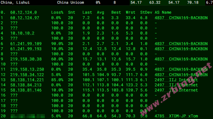 北京 联通 Softbank -> NoData 地理路径:日本 -> 北京 自治系统路径:AS4785 -> AS17676 -> AS4808 1 0.90ms 45.251.*.* AS4785 日本 大阪府 大阪市 xtom.com 2-3 0.67ms 172.16.*.* * RFC1918 5-7 1.93ms 211.15.*.* AS17676 [JPNIC-NET] 日本 大阪府 大阪 softbank.jp 12 96.20ms 124.65.*.* AS4808 [UNICOM-BJ] 中国 北京 www.bbn.com.cn 联通 17 94.47ms 221.222.*.* AS4808 [UNICOM-BJ] 中国 北京 海淀 www.bbn.com.cn 上海 联通 Softbank -> 4837 地理路径:日本 -> 北京 -> 上海 自治系统路径:AS4785 -> AS17676 -> AS4837 -> AS140979 1 0.97ms 45.251.*.* AS4785 日本 大阪府 大阪市 xtom.com 2-3 0.91ms 172.16.*.* * RFC1918 5 20.76ms 203.96.*.* AS4785 [OWL-JP] 日本 大阪府 大阪 xtom.com 6-7 0.98ms 211.15.*.* AS17676 [JPNIC-NET] 日本 大阪府 大阪 softbank.jp 12-13 94.93ms 219.158.*.* AS4837 [CU169-BACKBONE] 中国 北京 chinaunicom.cn 19 119.72ms 112.64.*.* AS140979 [APNIC-AP] 中国 上海市 闵行 chinaunicom.cn 联通 广东 联通 Softbank -> 4837 地理路径:日本 -> 北京 -> 广东 自治系统路径:AS4785 -> AS17676 -> AS4837 -> AS17816 -> AS136958 1 1.13ms 45.251.*.* AS4785 日本 大阪府 大阪市 xtom.com 2-3 0.74ms 172.16.*.* * RFC1918 5 1.88ms 203.96.*.* AS4785 [OWL-JP] 日本 大阪府 大阪 xtom.com 6-7 1.61ms 211.15.*.* AS17676 [JPNIC-NET] 日本 大阪府 大阪 softbank.jp 10-12 99.40ms 219.158.*.* AS4837 [CU169-BACKBONE] 中国 北京 chinaunicom.cn 联通 13 126.04ms 120.81.*.* AS17816 [APNIC-AP] 中国 广东省 中山市 中国联通 联通 19 105.25ms 157.148.*.* AS136958 [UNICOM-GD] 中国 广东省 广州市 chinaunicom.cn 联通