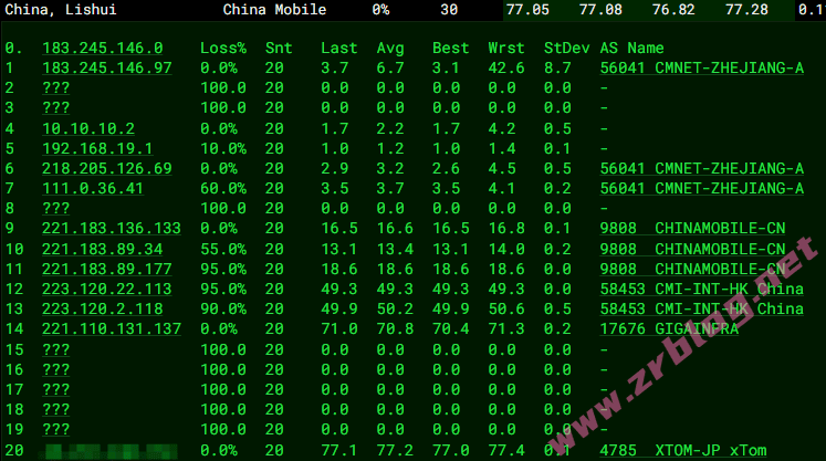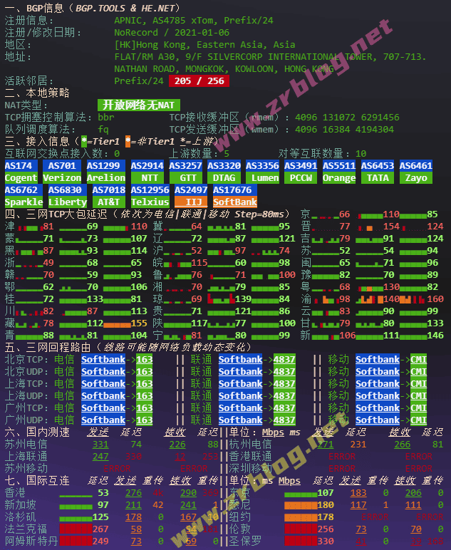 北京 移动 Softbank -> CMI 地理路径:日本 -> 北京 自治系统路径:AS4785 -> AS17676 -> AS58453 -> AS9808 -> AS58453 -> AS9808 -> AS56048 1 0.86ms 45.251.*.* AS4785 日本 大阪府 大阪市 xtom.com 2-3 0.71ms 172.16.*.* * RFC1918 5 5.82ms 203.96.*.* AS4785 [OWL-JP] 日本 大阪府 大阪 xtom.com 6-7 1.26ms 211.15.*.* AS17676 [JPNIC-NET] 日本 大阪府 大阪 softbank.jp 9 8.14ms 221.111.*.* AS17676 [BBTEC] 日本 东京都 东京 softbank.jp 10 79.63ms 223.120.*.* AS58453 [CMI-INT] 中国 北京 cmi.chinamobile.com 移动 11 76.00ms 221.183.*.* AS9808 [CMNET] 中国 北京 X-I chinamobileltd.com 移动 16-19 91.63ms 211.136.*.* AS56048 [CMNET] 中国 北京 bj.10086.cn 移动 20 87.18ms 211.136.*.* AS56048 [CMNET] 中国 北京 bj.10086.cn 移动 上海 移动 Softbank -> CMI 地理路径:日本 -> 上海 自治系统路径:AS4785 -> AS17676 -> AS9808 1 0.61ms 45.251.*.* AS4785 日本 大阪府 大阪市 xtom.com 2-3 0.73ms 172.16.*.* * RFC1918 5-7 3.04ms 211.15.*.* AS17676 [JPNIC-NET] 日本 大阪府 大阪 softbank.jp 9 8.52ms 221.111.*.* AS17676 [BBTEC] 日本 东京都 东京 softbank.jp 11-15 66.27ms 221.183.*.* AS9808 [CMNET] 中国 上海 X-I chinamobileltd.com 移动 16 65.45ms 117.185.*.* AS9808 [CMNET] 中国 上海市 chinamobileltd.com 移动 广东 移动 Softbank -> CMI 地理路径:日本 -> 香港 -> 广东 自治系统路径:AS4785 -> AS17676 -> AS58453 -> AS9808 -> AS58453 -> AS9808 -> AS56040 1 0.94ms 45.251.*.* AS4785 日本 大阪府 大阪市 xtom.com 2-3 0.64ms 172.16.*.* * RFC1918 5 3.03ms 203.96.*.* AS4785 [OWL-JP] 日本 大阪府 大阪 xtom.com 6-7 1.73ms 211.15.*.* AS17676 [JPNIC-NET] 日本 大阪府 大阪 softbank.jp 9 57.14ms 221.110.*.* AS17676 [BBTEC] 日本 东京都 东京 softbank.jp 10 58.90ms 223.120.*.* AS58453 [CMI-INT] 中国 香港 cmi.chinamobile.com 移动 11 61.98ms 223.120.*.* AS58453 [CMI-INT] 中国 广东 广州 cmi.chinamobile.com 移动 12 62.56ms 221.183.*.* AS9808 [CMNET] 中国 广东 广州 X-I chinamobileltd.com 移动 16 73.11ms 183.235.*.* AS56040 [APNIC-AP] 中国 广东 广州 gd.10086.cn 移动 17-18 67.09ms 211.136.*.* AS56040 [CMNET] 中国 广东 广州 gd.10086.cn 移动 23 78.19ms 211.139.*.* AS56040 [CMNET] 中国 广东 广州 gd.10086.cn 移动