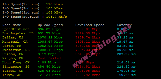 bench一键包磁盘IO和带宽信息,I/O下单过程中可以看到限制100MiB/s,实测在108MB/s左右