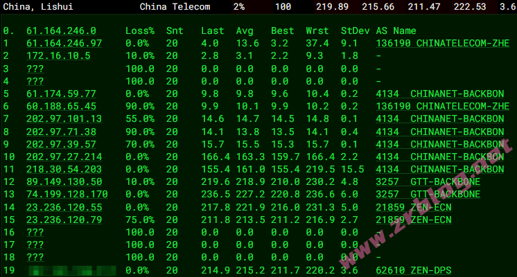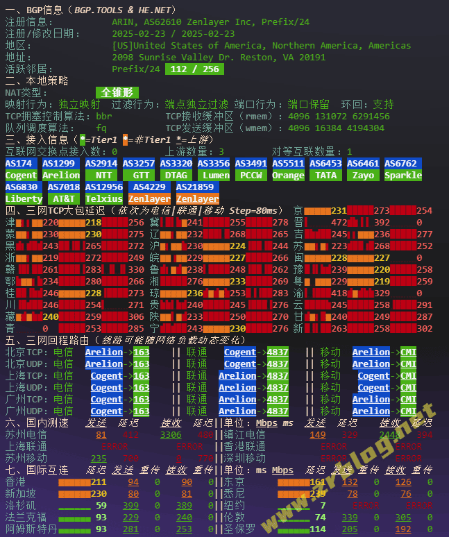 北京 电信 Arelion -> 163 地理路径:美国 -> 北京 自治系统路径:AS21859 -> AS1299 -> AS4134 -> AS4847 2-4 0.49ms 10.15.*.* * RFC1918 5-6 0.61ms 23.236.*.* AS21859 美国 哥伦比亚特区 华盛顿 zenlayer.com 7 1.18ms 107.155.*.* AS21859 美国 华盛顿哥伦比亚特区 华盛顿 zenlayer.com 8-9 1.12ms 62.115.*.* AS1299 [ARELION-NET] 美国 弗吉尼亚 阿什本 arelion.com 10-11 61.94ms 62.115.*.* AS1299 [ARELION-NET] 美国 加利福尼亚 洛杉矶 arelion.com 12 61.50ms 62.115.*.* AS1299 [ARELION-NET] 美国 德克萨斯 达拉斯 arelion.com 16-17 228.65ms 202.97.*.* AS4134 [CHINANET-BB] 中国 北京 chinatelecom.com.cn 电信 18 239.94ms 36.112.*.* AS4847 中国 北京 bj.189.cn 19 233.27ms 219.141.*.* AS4847 [CHINATELECOM-BJ] 中国 北京 bj.189.cn 20 234.57ms 219.141.*.* AS4847 [CHINATELECOM-BJ] 中国 北京 bj.189.cn 上海 电信 Cogent -> 163 地理路径:美国 -> 上海 自治系统路径:AS21859 -> AS174 -> AS4134 -> AS4812 2-4 0.37ms 10.15.*.* * RFC1918 5-6 0.66ms 23.236.*.* AS21859 美国 哥伦比亚特区 华盛顿 zenlayer.com 8 1.94ms 154.54.*.* AS174 [COGENT-BONE] 美国 华盛顿DC 华盛顿 cogentco.com 9 13.75ms 154.54.*.* AS174 [COGENT-BONE] 美国 俄亥俄 克里夫兰 cogentco.com 10 21.49ms 154.54.*.* AS174 [COGENT-BONE] 美国 伊利诺伊州 芝加哥 cogentco.com 11 29.61ms 154.54.*.* AS174 [COGENT-BONE] 美国 内布拉斯加 奥马哈 cogentco.com 12 40.02ms 154.54.*.* AS174 [COGENT-BONE] 美国 科罗拉多 丹佛 cogentco.com 13 50.65ms 154.54.*.* AS174 [COGENT-BONE] 美国 犹他 盐湖城 cogentco.com 14-15 64.74ms 154.54.*.* AS174 [COGENT-BONE] 美国 加利福尼亚 洛杉矶 cogentco.com 16 75.57ms 38.104.*.* AS174 美国 加利福尼亚 圣克拉拉 cogentco.com 17-19 211.81ms 202.97.*.* AS4134 [CHINANET-BB] 中国 上海 chinatelecom.com.cn 电信 20 218.60ms 101.95.*.* AS4812 [CHINANET-SH] 中国 上海 chinatelecom.cn 电信 26 218.17ms 101.226.*.* AS4812 [CHINANET-SH] 中国 上海市 chinatelecom.cn 电信 广东 电信 Cogent -> 163 地理路径:美国 -> 广东 自治系统路径:AS21859 -> AS174 -> AS4134 2-4 0.56ms 10.15.*.* * RFC1918 5-6 0.65ms 23.236.*.* AS21859 美国 哥伦比亚特区 华盛顿 zenlayer.com 8 1.78ms 154.54.*.* AS174 [COGENT-BONE] 美国 华盛顿DC 华盛顿 cogentco.com 9 14.17ms 154.54.*.* AS174 [COGENT-BONE] 美国 俄亥俄 克里夫兰 cogentco.com 10 21.29ms 154.54.*.* AS174 [COGENT-BONE] 美国 伊利诺伊州 芝加哥 cogentco.com 11 29.43ms 154.54.*.* AS174 [COGENT-BONE] 美国 内布拉斯加 奥马哈 cogentco.com 12 40.41ms 154.54.*.* AS174 [COGENT-BONE] 美国 科罗拉多 丹佛 cogentco.com 13 50.81ms 154.54.*.* AS174 [COGENT-BONE] 美国 犹他 盐湖城 cogentco.com 14-15 65.05ms 154.54.*.* AS174 [COGENT-BONE] 美国 加利福尼亚 洛杉矶 cogentco.com 16 69.24ms 38.104.*.* AS174 美国 加利福尼亚 圣克拉拉 cogentco.com 17-19 228.79ms 202.97.*.* AS4134 [CHINANET-BB] 中国 广东 广州 chinatelecom.com.cn 电信 26 229.38ms 183.47.*.* AS4134 [APNIC-AP] 中国 广东省 广州市 chinatelecom.com.cn 电信