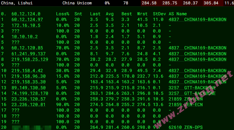 北京 联通 Cogent -> 4837 地理路径:美国 -> 北京 自治系统路径:AS21859 -> AS174 -> AS4837 -> AS4808 2-4 0.45ms 10.15.*.* * RFC1918 5-6 0.48ms 23.236.*.* AS21859 美国 哥伦比亚特区 华盛顿 zenlayer.com 8 1.62ms 154.54.*.* AS174 [COGENT-BONE] 美国 华盛顿DC 华盛顿 cogentco.com 9 13.81ms 154.54.*.* AS174 [COGENT-BONE] 美国 俄亥俄 克里夫兰 cogentco.com 10 21.27ms 154.54.*.* AS174 [COGENT-BONE] 美国 伊利诺伊州 芝加哥 cogentco.com 11 29.77ms 154.54.*.* AS174 [COGENT-BONE] 美国 内布拉斯加 奥马哈 cogentco.com 12 40.07ms 154.54.*.* AS174 [COGENT-BONE] 美国 科罗拉多 丹佛 cogentco.com 13 50.17ms 154.54.*.* AS174 [COGENT-BONE] 美国 犹他 盐湖城 cogentco.com 14-16 65.11ms 154.54.*.* AS174 [COGENT-BONE] 美国 加利福尼亚 洛杉矶 cogentco.com 17 281.18ms 38.88.*.* AS174 美国 加利福尼亚 洛杉矶 cogentco.com 18-20 240.62ms 219.158.*.* AS4837 [CU169-BACKBONE] 中国 北京 chinaunicom.cn 联通 22 268.98ms 61.148.*.* AS4808 [UNICOM-CN] 中国 北京 www.bbn.com.cn 26 294.26ms 221.222.*.* AS4808 [UNICOM-BJ] 中国 北京 海淀 www.bbn.com.cn 上海 联通 Arelion -> 4837 地理路径:美国 -> 北京 -> 上海 自治系统路径:AS21859 -> AS1299 -> AS4837 -> AS140979 2-4 0.61ms 10.15.*.* * RFC1918 5-6 0.62ms 23.236.*.* AS21859 美国 哥伦比亚特区 华盛顿 zenlayer.com 7-8 41.26ms 62.115.*.* AS1299 [ARELION-NET] 美国 弗吉尼亚 阿什本 arelion.com 9-10 63.87ms 62.115.*.* AS1299 [ARELION-NET] 美国 佐治亚 亚历山大 arelion.com 11 56.22ms 62.115.*.* AS1299 [ARELION-NET] 美国 加利福尼亚 洛杉矶 arelion.com 12 58.62ms 62.115.*.* AS1299 [ARELION-NET] 美国 德克萨斯 达拉斯 arelion.com 14 220.16ms 80.239.*.* AS1299 美国 加利福尼亚 洛杉矶 arelion.com 15-17 222.35ms 219.158.*.* AS4837 [CU169-BACKBONE] 中国 北京 chinaunicom.cn 联通 23 223.03ms 112.64.*.* AS140979 [APNIC-AP] 中国 上海市 闵行 chinaunicom.cn 联通 广东 联通 Arelion -> 4837 地理路径:美国 -> 北京 -> 广东 自治系统路径:AS21859 -> AS1299 -> AS4837 -> AS17816 -> AS136958 2-4 0.40ms 10.15.*.* * RFC1918 5-6 0.70ms 23.236.*.* AS21859 美国 哥伦比亚特区 华盛顿 zenlayer.com 7 1.11ms 107.155.*.* AS21859 美国 华盛顿哥伦比亚特区 华盛顿 zenlayer.com 8-9 1.14ms 62.115.*.* AS1299 [ARELION-NET] 美国 弗吉尼亚 阿什本 arelion.com 10-12 56.07ms 62.115.*.* AS1299 [ARELION-NET] 美国 加利福尼亚 洛杉矶 arelion.com 13 222.17ms 80.239.*.* AS1299 美国 加利福尼亚 洛杉矶 arelion.com 15-16 211.78ms 219.158.*.* AS4837 [CU169-BACKBONE] 中国 北京 chinaunicom.cn 联通 18 213.03ms 112.89.*.* AS17816 [APNIC-AP] 中国 广东 广州 中国联通 联通 23 216.08ms 157.148.*.* AS136958 [UNICOM-GD] 中国 广东省 广州市 chinaunicom.cn 联通