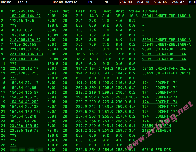北京 移动 Arelion -> CMI 地理路径:美国 -> 北京 自治系统路径:AS21859 -> AS1299 -> AS58453 -> AS1299 -> AS58453 -> AS9808 -> AS56048 2-4 0.40ms 10.15.*.* * RFC1918 5-6 0.66ms 23.236.*.* AS21859 美国 哥伦比亚特区 华盛顿 zenlayer.com 7 1.06ms 107.155.*.* AS21859 美国 华盛顿哥伦比亚特区 华盛顿 zenlayer.com 8 2.58ms 62.115.*.* AS1299 [ARELION-NET] 美国 弗吉尼亚 阿什本 arelion.com 9 58.67ms 62.115.*.* AS1299 [ARELION-NET] 美国 加利福尼亚 洛杉矶 arelion.com 10 63.74ms 62.115.*.* AS1299 [ARELION-NET] 美国 佐治亚 亚历山大 arelion.com 11 61.89ms 62.115.*.* AS1299 [ARELION-NET] 美国 德克萨斯 达拉斯 arelion.com 14 60.05ms 223.120.*.* AS58453 [CMI-INT] 美国 加利福尼亚 洛杉矶 cmi.chinamobile.com 移动 17-18 241.15ms 221.183.*.* AS9808 [CMNET] 中国 北京 X-I chinamobileltd.com 移动 19-22 253.36ms 211.136.*.* AS56048 [CMNET] 中国 北京 bj.10086.cn 移动 25 249.80ms 211.136.*.* AS56048 [CMNET] 中国 北京 bj.10086.cn 移动 上海 移动 Cogent -> CMI 地理路径:美国 -> 上海 自治系统路径:AS21859 -> AS174 -> AS58453 -> AS9808 2-4 0.45ms 10.15.*.* * RFC1918 5-6 0.58ms 23.236.*.* AS21859 美国 哥伦比亚特区 华盛顿 zenlayer.com 8 1.89ms 154.54.*.* AS174 [COGENT-BONE] 美国 华盛顿DC 华盛顿 cogentco.com 9 18.63ms 154.54.*.* AS174 [COGENT-BONE] 美国 佐治亚 亚历山大 cogentco.com 10 25.29ms 154.54.*.* AS174 [COGENT-BONE] 美国 犹他 盐湖城 cogentco.com 11 33.20ms 154.54.*.* AS174 [COGENT-BONE] 美国 德克萨斯 达拉斯 cogentco.com 12 44.18ms 154.54.*.* AS174 [COGENT-BONE] 美国 得克萨斯州 埃尔帕索 cogentco.com 13 53.15ms 154.54.*.* AS174 [COGENT-BONE] 美国 亚利桑那 凤凰城 cogentco.com 14-15 64.80ms 154.54.*.* AS174 [COGENT-BONE] 美国 加利福尼亚 洛杉矶 cogentco.com 16 63.80ms 38.104.*.* AS174 美国 加利福尼亚 洛杉矶 cogentco.com 17 63.77ms 223.120.*.* AS58453 [CMI-INT] 美国 加利福尼亚 洛杉矶 cmi.chinamobile.com 移动 18 255.78ms 223.120.*.* AS58453 [CMI-INT] 中国 上海 cmi.chinamobile.com 移动 19-21 262.89ms 221.183.*.* AS9808 [CMNET] 中国 上海 X-I chinamobileltd.com 移动 24 270.66ms 117.185.*.* AS9808 [CMNET] 中国 上海市 chinamobileltd.com 移动 广东 移动 Arelion -> CMI 地理路径:美国 -> 广东 自治系统路径:AS21859 -> AS1299 -> AS58453 -> AS9808 -> AS56040 2-4 0.36ms 10.15.*.* * RFC1918 5-6 0.74ms 23.236.*.* AS21859 美国 哥伦比亚特区 华盛顿 zenlayer.com 7-9 1.46ms 62.115.*.* AS1299 [ARELION-NET] 美国 弗吉尼亚 阿什本 arelion.com 10 6.43ms 62.115.*.* AS1299 [ARELION-NET] 美国 新泽西州 纽瓦克 arelion.com 11 23.10ms 62.115.*.* AS1299 [ARELION-NET] 美国 伊利诺伊 芝加哥 arelion.com 12 63.39ms 62.115.*.* AS1299 [ARELION-NET] 美国 华盛顿 西雅图 arelion.com 13-14 138.34ms 223.120.*.* AS58453 [CMI-INT] 美国 华盛顿州 西雅图 cmi.chinamobile.com 移动 15 205.63ms 223.120.*.* AS58453 [CMI-INT] 中国 广东 广州 cmi.chinamobile.com 移动 16-19 292.68ms 221.183.*.* AS9808 [CMNET] 中国 广东 广州 I-C chinamobileltd.com 移动 20 289.14ms 211.136.*.* AS56040 [CMNET] 中国 广东 广州 gd.10086.cn 移动 21-23 286.51ms 183.235.*.* AS56040 [APNIC-AP] 中国 广东 广州 gd.10086.cn 移动 26 315.44ms 211.139.*.* AS56040 [CMNET] 中国 广东 广州 gd.10086.cn 移动