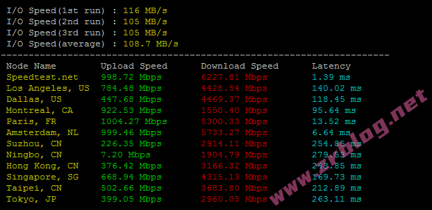 bench一键包磁盘IO和带宽信息,I/O下单过程中可以看到限制100MiB/s,实测在108MB/s左右