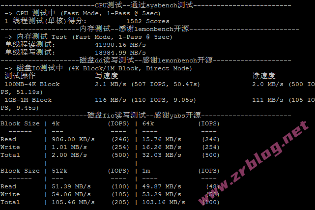 CPU跑分、内存和磁盘dd/fio读写测试结果: