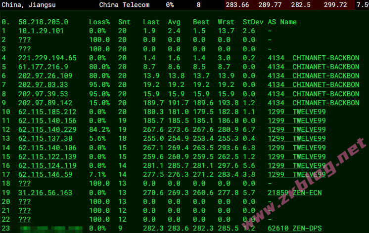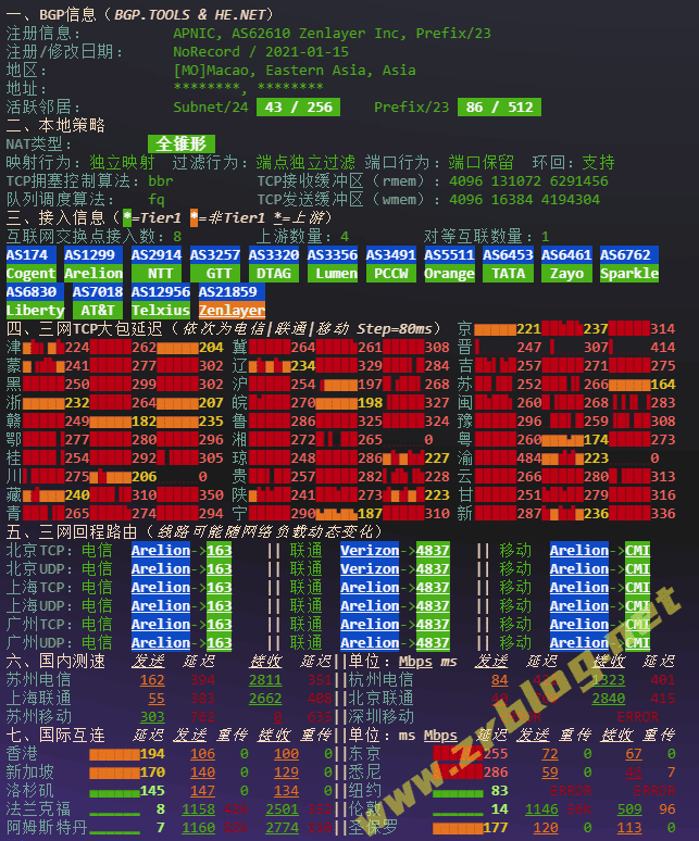 北京 电信 Arelion -> 163 地理路径:德国 -> 北京 自治系统路径:AS21859 -> AS1299 -> AS4134 -> AS4847 2-4 0.83ms 10.20.*.* * RFC1918 6 5.18ms 31.216.*.* AS21859 德国 黑森 美因河畔法兰克福 zenlayer.com 7-9 2.48ms 62.115.*.* AS1299 [ARELION-NET] 德国 黑森州 美因河畔法兰克福 arelion.com 10 4.43ms 118.85.*.* AS4134 [CHINANET-BB] 德国 黑森 美因河畔法兰克福 Telia-CTEuro-PoP chinatelecom.com.cn 电信 11-12 214.97ms 202.97.*.* AS4134 [CHINANET-BB] 中国 北京 chinatelecom.com.cn 电信 13 223.68ms 36.112.*.* AS4847 中国 北京 bj.189.cn 14-15 236.62ms 219.141.*.* AS4847 [CHINATELECOM-BJ] 中国 北京 bj.189.cn 16 223.60ms 106.37.*.* AS4847 [CHINANET-HN] 中国 北京 bj.189.cn 上海 电信 Arelion -> 163 地理路径:德国 -> 上海 自治系统路径:AS21859 -> AS1299 -> AS4134 -> AS4812 -> AS4134 -> AS4812 2-4 0.45ms 10.20.*.* * RFC1918 6 1.38ms 31.216.*.* AS21859 德国 黑森 美因河畔法兰克福 zenlayer.com 7-9 2.37ms 62.115.*.* AS1299 [ARELION-NET] 德国 黑森州 美因河畔法兰克福 arelion.com 10 4.03ms 202.97.*.* AS4134 [CHINANET-BB] 德国 黑森 美因河畔法兰克福 CT-POP chinatelecom.com.cn 电信 11 249.17ms 202.97.*.* AS4134 [CHINANET-BB] 中国 上海 chinatelecom.com.cn 电信 12 269.80ms 101.95.*.* AS4812 [CHINANET-SH] 中国 上海 chinatelecom.cn 电信 18 276.68ms 101.226.*.* AS4812 [CHINANET-SH] 中国 上海市 chinatelecom.cn 电信 广东 电信 Arelion -> 163 地理路径:德国 -> 法国 -> 北京 -> 广东 自治系统路径:AS21859 -> AS1299 -> AS4134 2-4 0.65ms 10.20.*.* * RFC1918 6 1.97ms 31.216.*.* AS21859 德国 黑森 美因河畔法兰克福 zenlayer.com 7-8 1.69ms 62.115.*.* AS1299 [ARELION-NET] 德国 黑森州 美因河畔法兰克福 arelion.com 9-10 10.48ms 62.115.*.* AS1299 [ARELION-NET] 法国 法兰西岛大区 巴黎 arelion.com 11 10.42ms 81.173.*.* AS4134 法国 法兰西岛大区 巴黎 chinatelecom.com.cn 12 242.39ms 202.97.*.* AS4134 [CHINANET-BB] 中国 北京 北京 chinatelecom.com.cn 13-14 254.58ms 202.97.*.* AS4134 [CHINANET-BB] 中国 广东 广州 chinatelecom.com.cn 17 251.62ms 113.108.*.* AS4134 [CHINANET-GD] 中国 广东省 广州市 chinatelecom.com.cn 电信 21 257.57ms 183.47.*.* AS4134 [APNIC-AP] 中国 广东省 广州市 chinatelecom.com.cn 电信