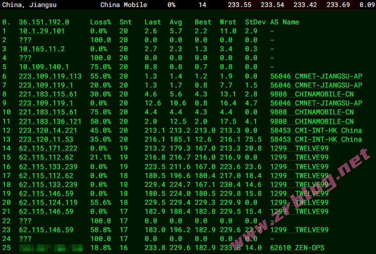 北京 移动 Arelion -> CMI 地理路径:德国 -> 法国 -> 美国 -> 北京 自治系统路径:AS21859 -> AS1299 -> AS58453 -> AS9808 -> AS56048 2-4 0.67ms 10.20.*.* * RFC1918 6 1.17ms 31.216.*.* AS21859 德国 黑森 美因河畔法兰克福 zenlayer.com 7-8 4.44ms 62.115.*.* AS1299 [ARELION-NET] 德国 黑森州 美因河畔法兰克福 arelion.com 9 10.09ms 62.115.*.* AS1299 [ARELION-NET] 法国 法兰西岛大区 巴黎 arelion.com 10 97.76ms 62.115.*.* AS1299 [ARELION-NET] 美国 弗吉尼亚 阿什本 arelion.com 11-12 146.28ms 62.115.*.* AS1299 [ARELION-NET] 美国 加利福尼亚 洛杉矶 arelion.com 13 153.63ms 62.115.*.* AS1299 [ARELION-NET] 美国 德克萨斯 达拉斯 arelion.com 15-16 146.47ms 223.120.*.* AS58453 [CMI-INT] 美国 加利福尼亚 洛杉矶 cmi.chinamobile.com 移动 17-20 260.48ms 221.183.*.* AS9808 [CMNET] 中国 北京 X-I chinamobileltd.com 移动 21-25 312.14ms 211.136.*.* AS56048 [CMNET] 中国 北京 bj.10086.cn 移动 26 326.83ms 211.136.*.* AS56048 [CMNET] 中国 北京 bj.10086.cn 移动 上海 移动 Arelion -> CMI 地理路径:德国 -> 法国 -> 英国 -> 上海 自治系统路径:AS21859 -> AS1299 -> AS58453 -> AS9808 2-4 0.62ms 10.20.*.* * RFC1918 6 32.11ms 31.216.*.* AS21859 德国 黑森 美因河畔法兰克福 zenlayer.com 7-8 4.12ms 62.115.*.* AS1299 [ARELION-NET] 德国 黑森州 美因河畔法兰克福 arelion.com 9 10.26ms 62.115.*.* AS1299 [ARELION-NET] 法国 法兰西岛大区 巴黎 arelion.com 10-11 16.97ms 62.115.*.* AS1299 [ARELION-NET] 英国 英格兰 伦敦 arelion.com 13 18.27ms 223.120.*.* AS58453 [CMI-INT] 英国 英格兰 伦敦 cmi.chinamobile.com 移动 14 259.83ms 223.120.*.* AS58453 [CMI-INT] 中国 上海 cmi.chinamobile.com 移动 15-17 250.32ms 221.183.*.* AS9808 [CMNET] 中国 上海 X-I chinamobileltd.com 移动 20 262.90ms 117.185.*.* AS9808 [CMNET] 中国 上海市 chinamobileltd.com 移动 广东 移动 Arelion -> CMI 地理路径:德国 -> 北京 -> 广东 自治系统路径:AS21859 -> AS1299 -> AS58453 -> AS9808 -> AS56040 2-4 0.47ms 10.20.*.* * RFC1918 6 1.47ms 31.216.*.* AS21859 德国 黑森 美因河畔法兰克福 zenlayer.com 7-10 2.86ms 62.115.*.* AS1299 [ARELION-NET] 德国 黑森州 美因河畔法兰克福 arelion.com 11 2.27ms 223.120.*.* AS58453 [CMI-INT] 德国 黑森 美茵河畔法兰克福 cmi.chinamobile.com 移动 12 183.49ms 223.120.*.* AS58453 [CMI-INT] 中国 北京 cmi.chinamobile.com 移动 13 211.43ms 223.120.*.* AS58453 [CMI-INT] 中国 广东 广州 cmi.chinamobile.com 14-15 164.00ms 221.183.*.* AS9808 [CMNET] 中国 广东 广州 X-I chinamobileltd.com 移动 18-20 248.26ms 211.136.*.* AS56040 [CMNET] 中国 广东 广州 gd.10086.cn 移动 21 280.46ms 120.198.*.* AS56040 [APNIC-AP] 中国 广东 广州 gd.10086.cn 移动