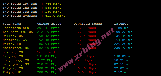 bench一键包磁盘IO和带宽信息,I/O在611MB/s左右,端口200M