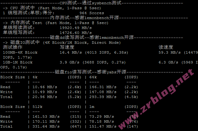 CPU跑分、内存和磁盘dd/fio读写测试结果: