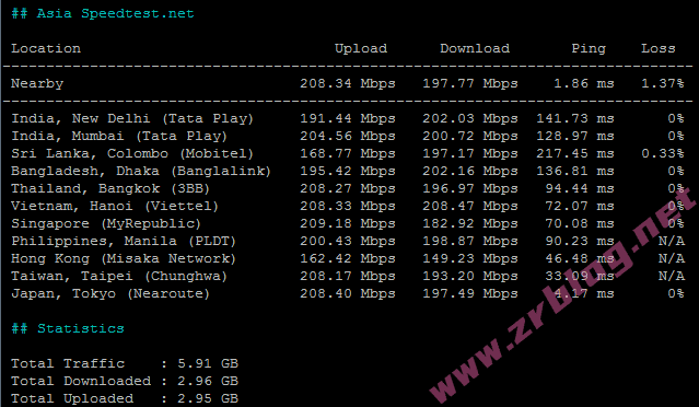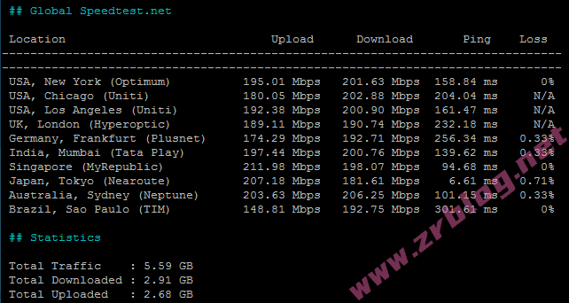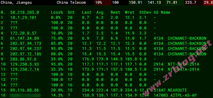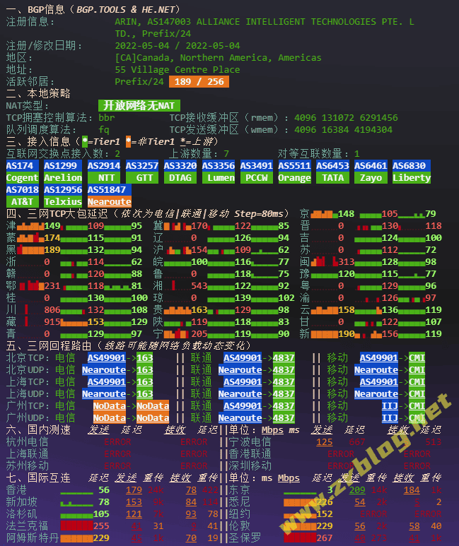 北京 电信 AS49901 -> 163 地理路径:香港 -> 日本 -> 北京 自治系统路径:AS49901 -> AS4134 -> AS4847 1 0.27ms 38.47.*.* AS49901 中国 香港 KUIPER NETWORK LTD 3 1.98ms 10.50.*.* * RFC1918 9 219.06ms 203.215.*.* AS4134 [CHINANET-FJ] 日本 东京都 东京 chinatelecom.com.cn 电信 10-12 130.47ms 202.97.*.* AS4134 [CHINANET-BB] 中国 北京 chinatelecom.com.cn 电信 14 146.85ms 36.112.*.* AS4847 中国 北京 bj.189.cn 15-16 86.40ms 219.141.*.* AS4847 [CHINATELECOM-BJ] 中国 北京 bj.189.cn 17 108.67ms 106.37.*.* AS4847 [CHINANET-HN] 中国 北京 bj.189.cn 上海 电信 AS49901 -> 163 地理路径:香港 -> 日本 -> 上海 自治系统路径:AS49901 -> AS4134 -> AS4812 1 0.52ms 38.47.*.* AS49901 中国 香港 KUIPER NETWORK LTD 3 1.89ms 10.50.*.* * RFC1918 9 161.42ms 203.215.*.* AS4134 [CHINANET-FJ] 日本 东京都 东京 chinatelecom.com.cn 电信 10-12 73.80ms 202.97.*.* AS4134 [CHINANET-BB] 中国 上海 chinatelecom.com.cn 电信 19 114.64ms 101.226.*.* AS4812 [CHINANET-SH] 中国 上海市 chinatelecom.cn 电信 广东 电信 Unknown -> NoData 地理路径:香港 自治系统路径:AS49901 1 0.56ms 38.47.*.* AS49901 中国 香港 KUIPER NETWORK LTD 3 1.76ms 10.50.*.* * RFC1918