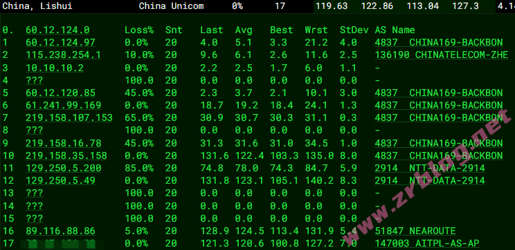 北京 联通 AS49901 -> 4837 地理路径:香港 -> 上海 -> 北京 自治系统路径:AS49901 -> AS4837 -> AS4808 1 0.31ms 38.47.*.* AS49901 中国 香港 KUIPER NETWORK LTD 3 1.85ms 10.50.*.* * RFC1918 9-10 108.77ms 219.158.*.* AS4837 [CU169-BACKBONE] 中国 上海 X-I chinaunicom.cn 联通 12 109.83ms 219.158.*.* AS4837 [CU169-BACKBONE] 中国 北京 chinaunicom.cn 联通 13 119.86ms 124.65.*.* AS4808 [UNICOM-BJ] 中国 北京 www.bbn.com.cn 联通 15 111.49ms 61.149.*.* AS4808 [UNICOM-CN] 中国 北京 www.bbn.com.cn 17 118.81ms 221.222.*.* AS4808 [UNICOM-BJ] 中国 北京 海淀 www.bbn.com.cn 上海 联通 AS49901 -> 4837 地理路径:香港 -> 上海 自治系统路径:AS49901 -> AS4837 -> AS140979 1 0.49ms 38.47.*.* AS49901 中国 香港 KUIPER NETWORK LTD 3 2.31ms 10.50.*.* * RFC1918 9 113.17ms 219.158.*.* AS4837 [CU169-BACKBONE] 中国 上海 X-I chinaunicom.cn 联通 10 110.00ms 219.158.*.* AS4837 [CU169-BACKBONE] 中国 北京市 chinaunicom.cn 联通 18 110.83ms 112.64.*.* AS140979 [APNIC-AP] 中国 上海市 闵行 chinaunicom.cn 联通 广东 联通 AS49901 -> 4837 地理路径:香港 -> 上海 -> 广东 自治系统路径:AS49901 -> AS4837 -> AS17816 -> AS136958 1 0.50ms 38.47.*.* AS49901 中国 香港 KUIPER NETWORK LTD 3 2.73ms 10.50.*.* * RFC1918 9-11 121.40ms 219.158.*.* AS4837 [CU169-BACKBONE] 中国 上海 X-I chinaunicom.cn 联通 13 128.66ms 120.80.*.* AS17816 [APNIC-AP] 中国 广东 广州 China Unicom IP network China169 Guangdong province 15 131.71ms 58.254.*.* AS136958 中国 广东省 广州市 chinaunicom.cn 联通 19 131.29ms 157.148.*.* AS136958 [UNICOM-GD] 中国 广东省 广州市 chinaunicom.cn 联通