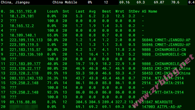 北京 移动 AS49901 -> CMI 地理路径:香港 -> 北京 自治系统路径:AS49901 -> AS58453 -> AS9808 -> AS56048 1 0.34ms 38.47.*.* AS49901 中国 香港 KUIPER NETWORK LTD 3 2.14ms 10.50.*.* * RFC1918 9 72.02ms 223.120.*.* AS58453 [CMI-INT] 中国 北京 cmi.chinamobile.com 10-11 67.66ms 221.183.*.* AS9808 [CMNET] 中国 北京 X-I chinamobileltd.com 移动 15-17 79.58ms 211.136.*.* AS56048 [CMNET] 中国 北京 bj.10086.cn 移动 19 97.98ms 211.136.*.* AS56048 [CMNET] 中国 北京 bj.10086.cn 移动 上海 移动 AS49901 -> CMI 地理路径:香港 -> 上海 自治系统路径:AS49901 -> AS9808 1 0.41ms 38.47.*.* AS49901 中国 香港 KUIPER NETWORK LTD 3 1.68ms 10.50.*.* * RFC1918 10-12 55.06ms 221.183.*.* AS9808 [CMNET] 中国 上海 X-I chinamobileltd.com 移动 15 81.19ms 117.185.*.* AS9808 [CMNET] 中国 上海市 chinamobileltd.com 移动 广东 移动 IIJ -> CMI 地理路径:香港 -> 广东 自治系统路径:AS49901 -> AS2497 -> AS58453 -> AS9808 -> AS56040 1 0.64ms 38.47.*.* AS49901 中国 香港 KUIPER NETWORK LTD 3 12.88ms 10.50.*.* * RFC1918 9 53.56ms 210.130.*.* AS2497 [JPNIC-NET] 日本 东京都 东京 iij.ad.jp 10 54.20ms 223.120.*.* AS58453 [CMI-INT] 中国 香港 cmi.chinamobile.com 移动 11 57.34ms 223.120.*.* AS58453 [CMI-INT] 中国 广东 广州 cmi.chinamobile.com 移动 12-15 57.77ms 221.183.*.* AS9808 [CMNET] 中国 广东 广州 X-I chinamobileltd.com 移动 16-17 85.44ms 211.136.*.* AS56040 [CMNET] 中国 广东 深圳 gd.10086.cn 移动 18-19 96.70ms 120.198.*.* AS56040 [APNIC-AP] 中国 广东 广州 gd.10086.cn 移动 23 99.29ms 211.139.*.* AS56040 [CMNET] 中国 广东 广州 gd.10086.cn 移动